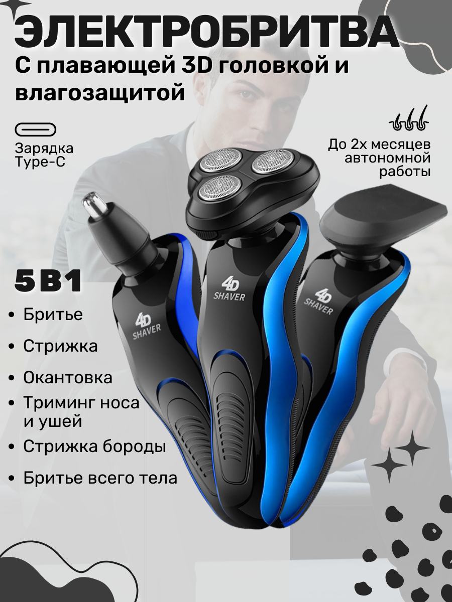 | Дополнительная информация | Электробритва; Плавующая 4D головка; Триммер для ушей и носа; Тример для висков, окантовки и бороды |