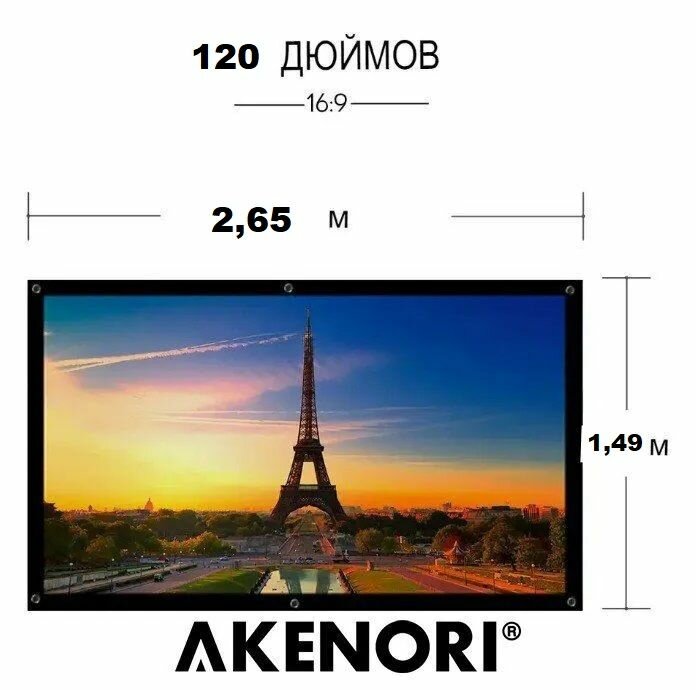 Экран для проектора ПВХ 120 дюймов Akenori матовый, серый с черной рамкой и кольцами В тубусе 16:9 120BGT информация: