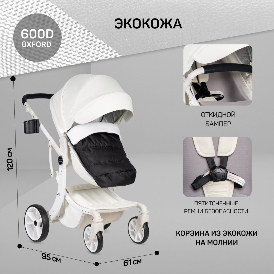 Детская коляска-трансформер Aimile Original PRO, для новорожденных, экокожа, люлька для новорожденных, 2 в 1, цвет белый информация:
