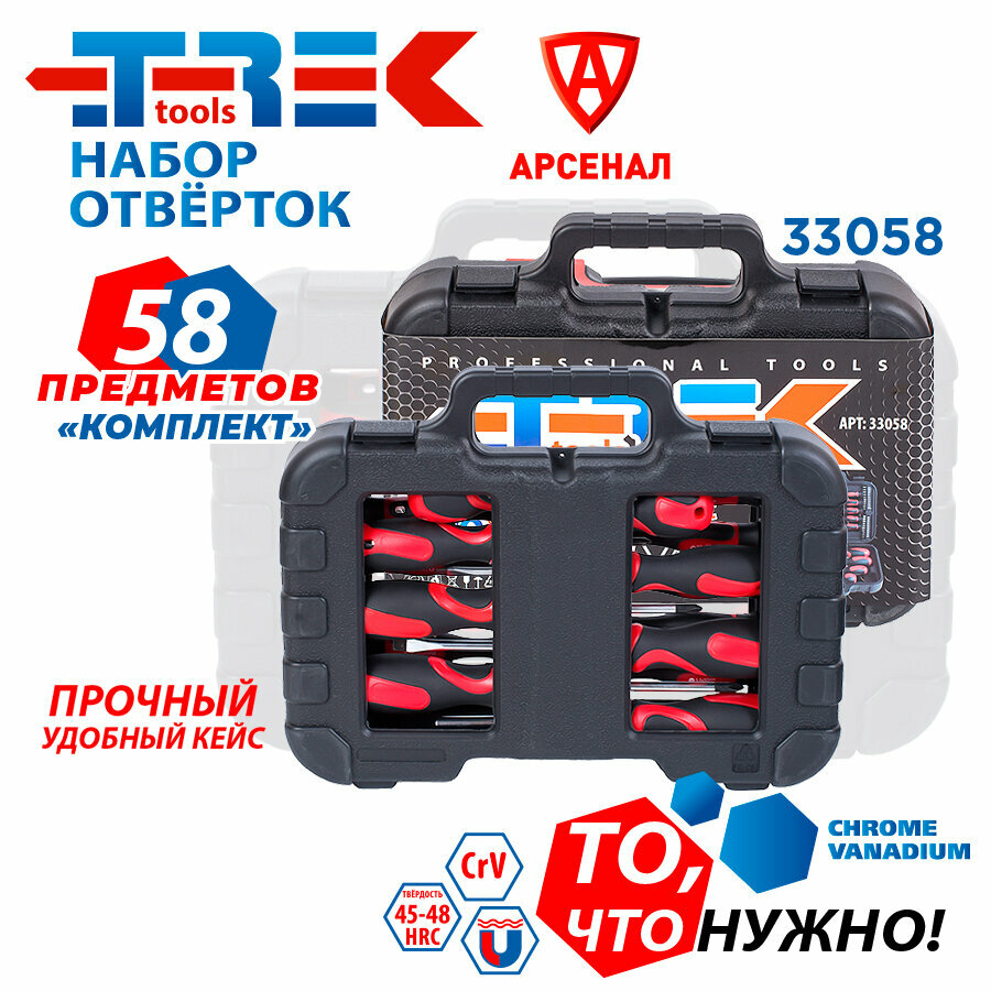 Набор отверток и бит 58 предметов в кейсе "Комплект" TREK TR33058 (магнитные наконечники SL, PH, Torx) информация: