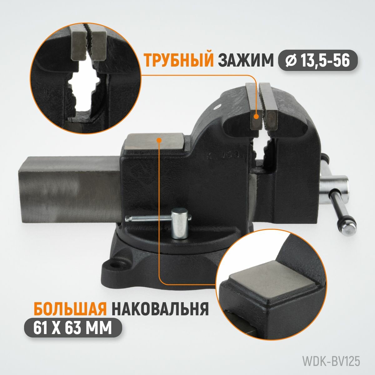 Профессиональные слесарные тиски поворотные с наковальней 125 мм, WDK-BV125 информация:
