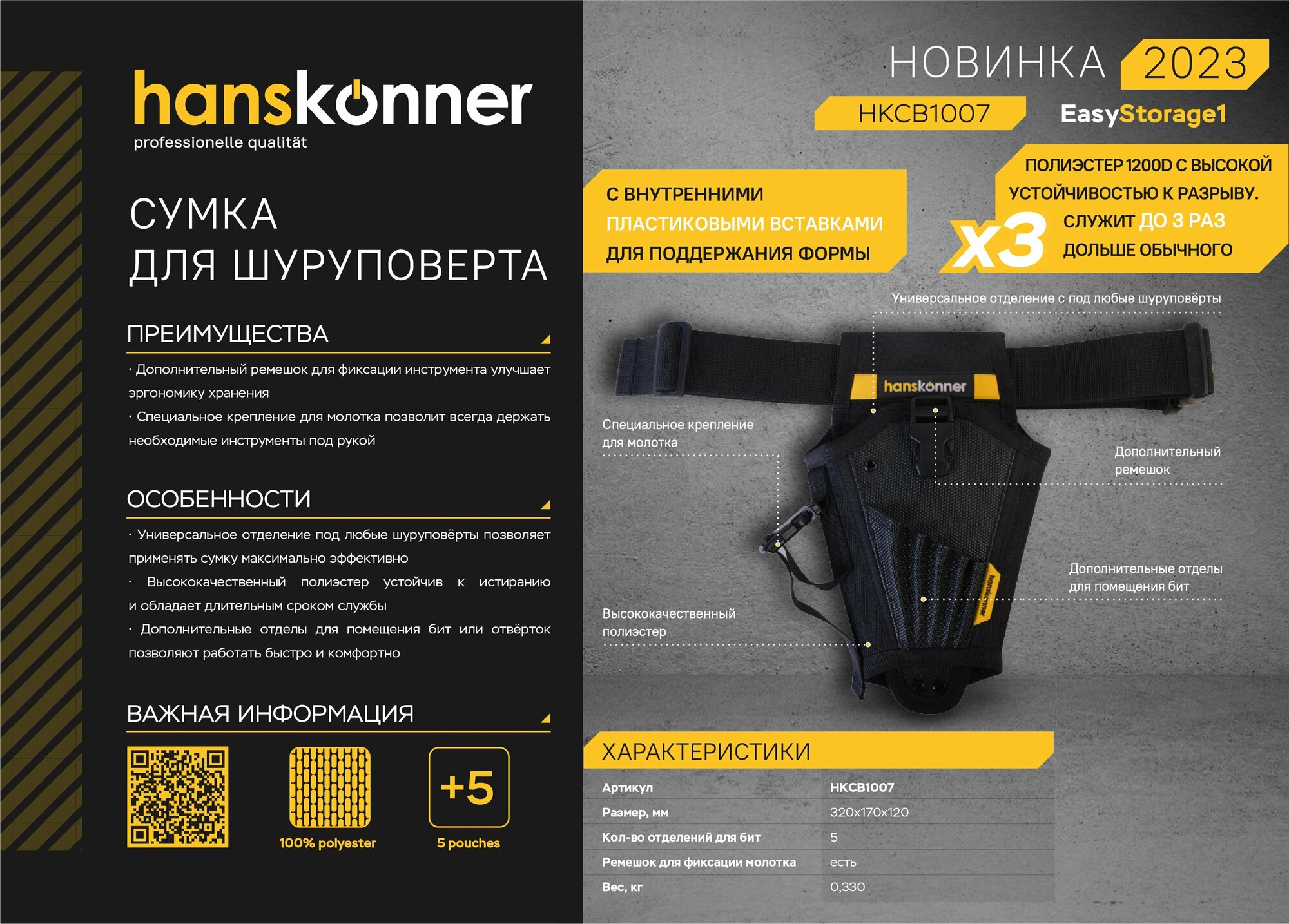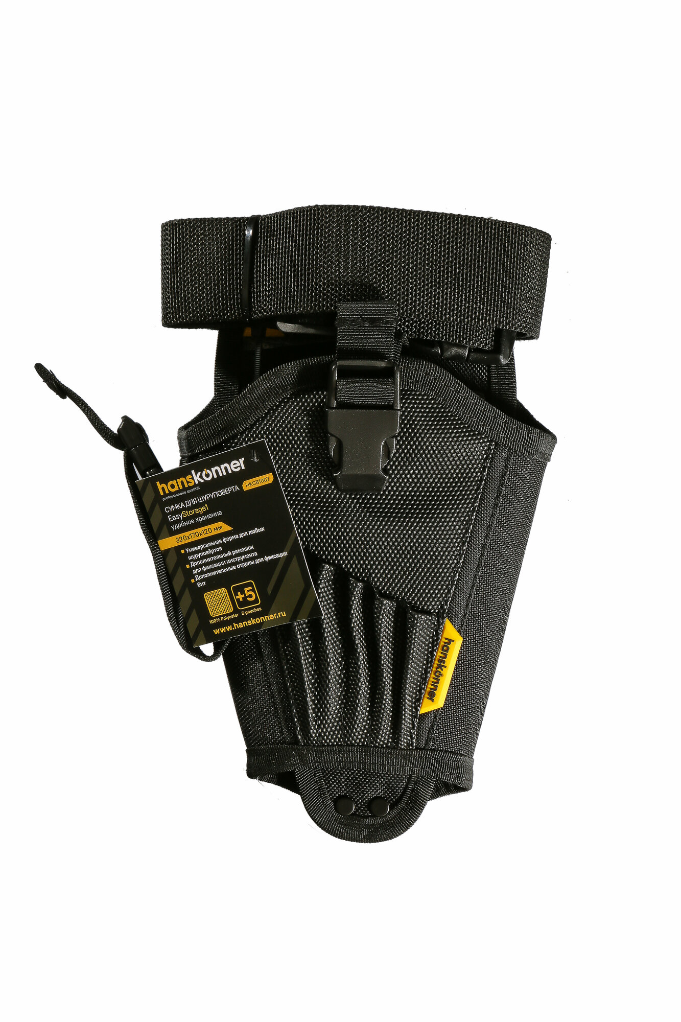Сумка Hanskonner HKCB1007 для шуруповерта, полиэстер, 5 отделений для бит, крепления для молотка информация: