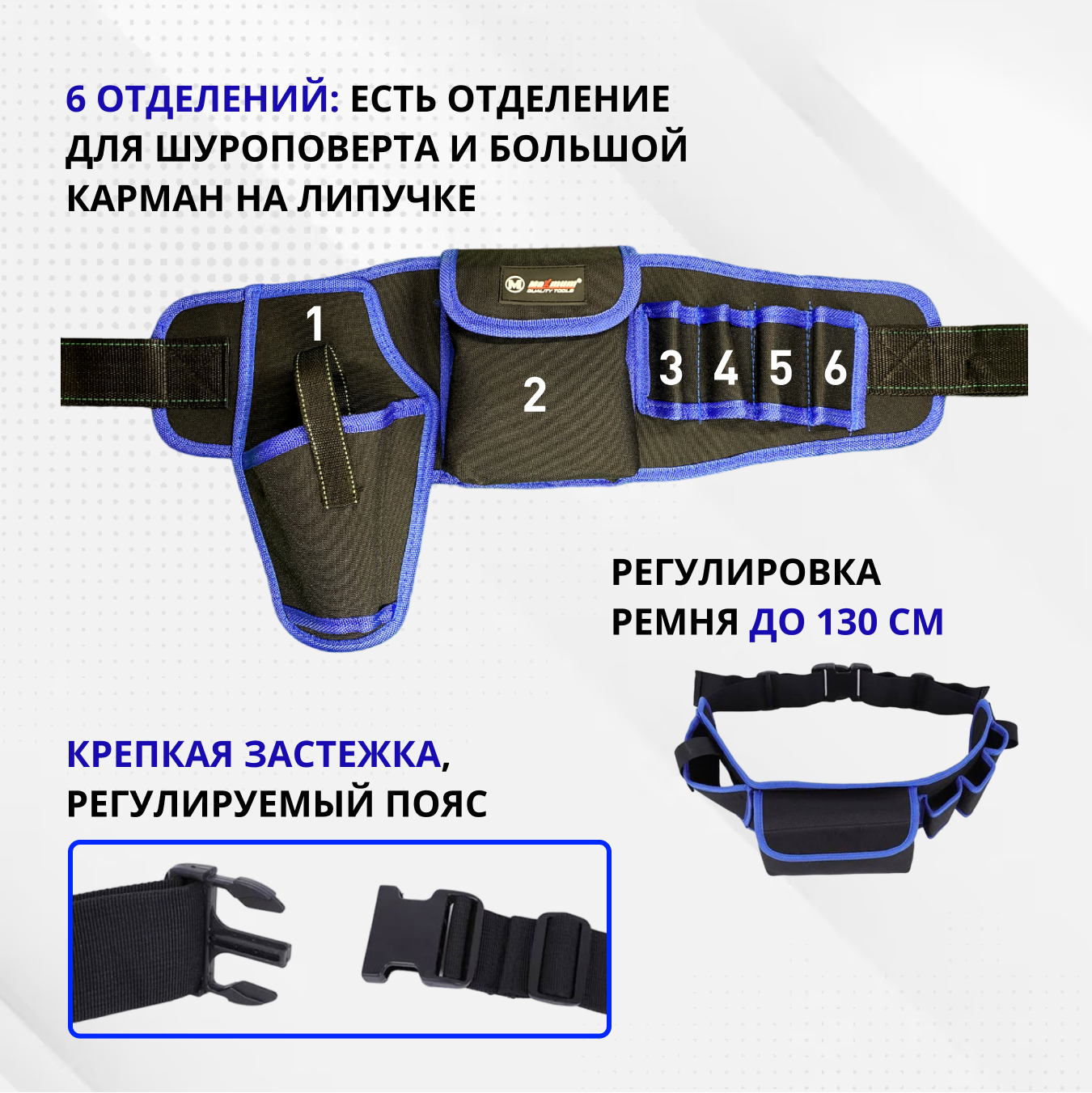 Пояс для инструмента, 4 кармана+ кобура для шуруповёрта + большая сумка на липучке, высокопрочная ткань Оксфорд 600.