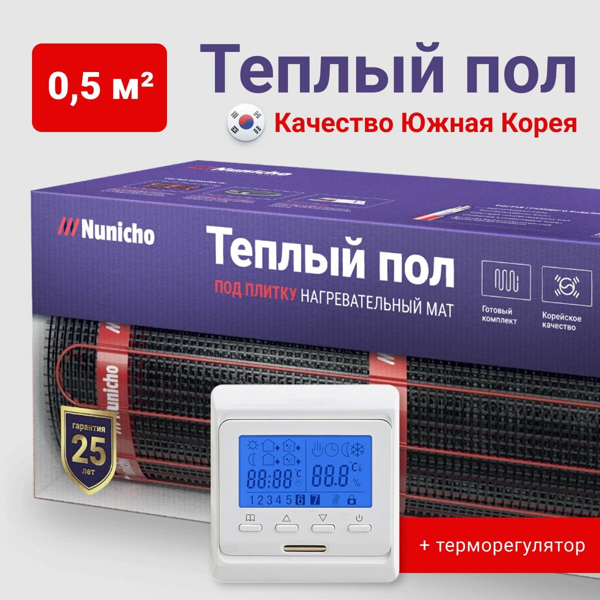10 цен на Теплый пол электрический под плитку 0,5 м2 Nunicho 150 Вт/м2 с терморегулятором программируемым белым, нагревательный мат пр-во Южная Корея