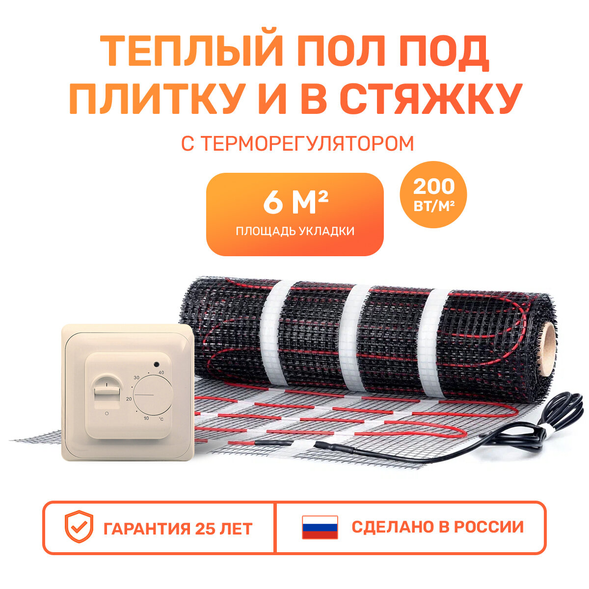 Электрический теплый пол 6 м2 с механическим бежевым терморегулятором Тепло и Точка, 200 Вт/м2 двужильный экранированный нагревательный мат под плитку информация:
