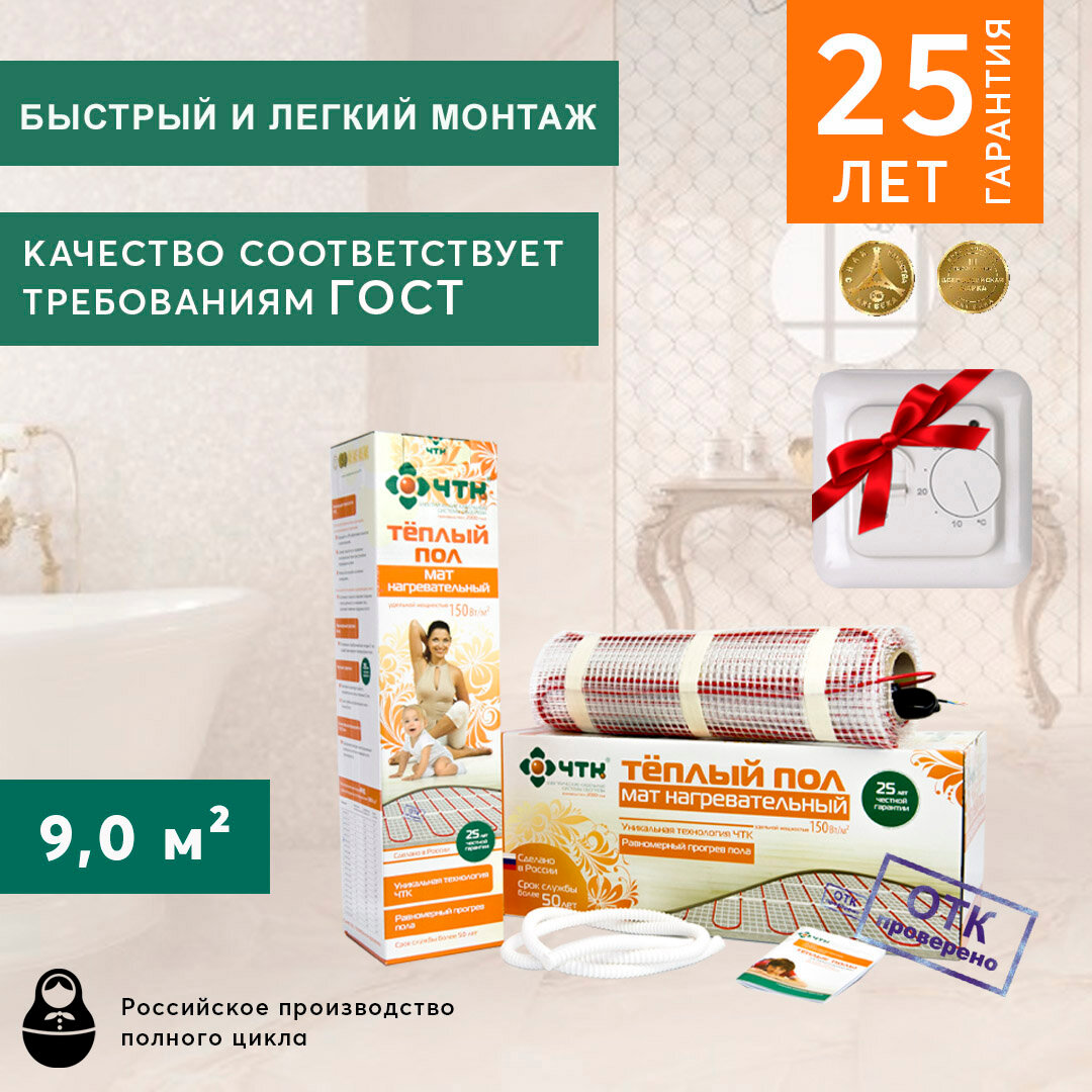 Теплый пол Нагревательный мат в стяжку/плиточный клей "ЧТК" МНД 150-1350, площадь 9,0 м.кв., в подарок Механический терморегулятор! информация:
