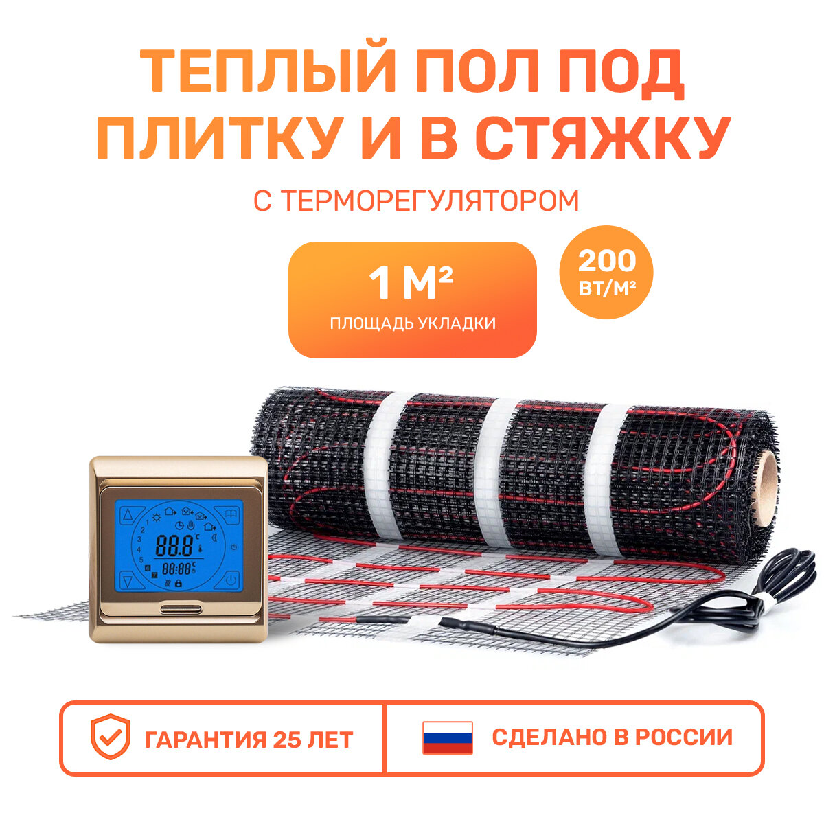 Электрический теплый пол 1 м2 с сенсорным золотистым терморегулятором Тепло и Точка, 200 Вт/м2 двужильный экранированный нагревательный мат под плитку информация: