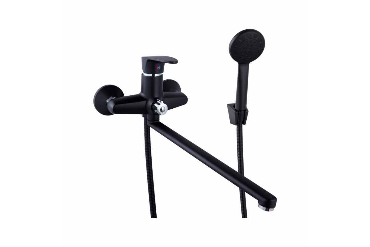 PL2205-7 Смеситель д/ванной, ABS пластик, длинный излив из латуни, лейка, шланг, крепление на стену, кран-буксы, чёрный