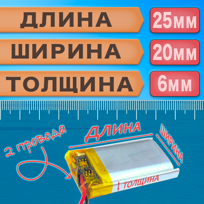 Аккумулятор (батарея) 602025 250mah 3,7v (25х20х6 мм) информация: