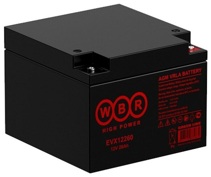 | Дополнительная информация | WBR серии EVX – тяговые аккумуляторные батареи, герметизированные, необслуживаемые, выполненные по технологии AGM. Батареи WBR серии EVX обладают высоким качеством и надежностью, безопасны в эксплуатации, устойчивы к глубоким разрядам и применяются для питания электрических транспортных средств, гольфкаров, полотерных машин, инвалидных колясок, осветительных приборов и другого вспомогательного оборудования. |