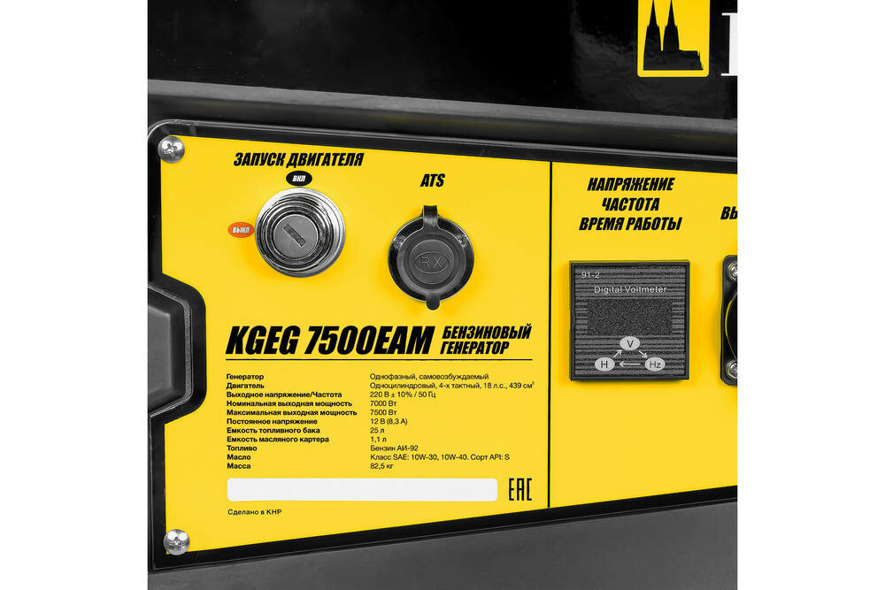 Kolner KGEG 7500EAМ (1шт) Генератор бензиновый 7500 Вт, однофазный, двигатель одноцилиндровый, 4-х тактный, 18л.с (кн7500еам) KOLNER информация: