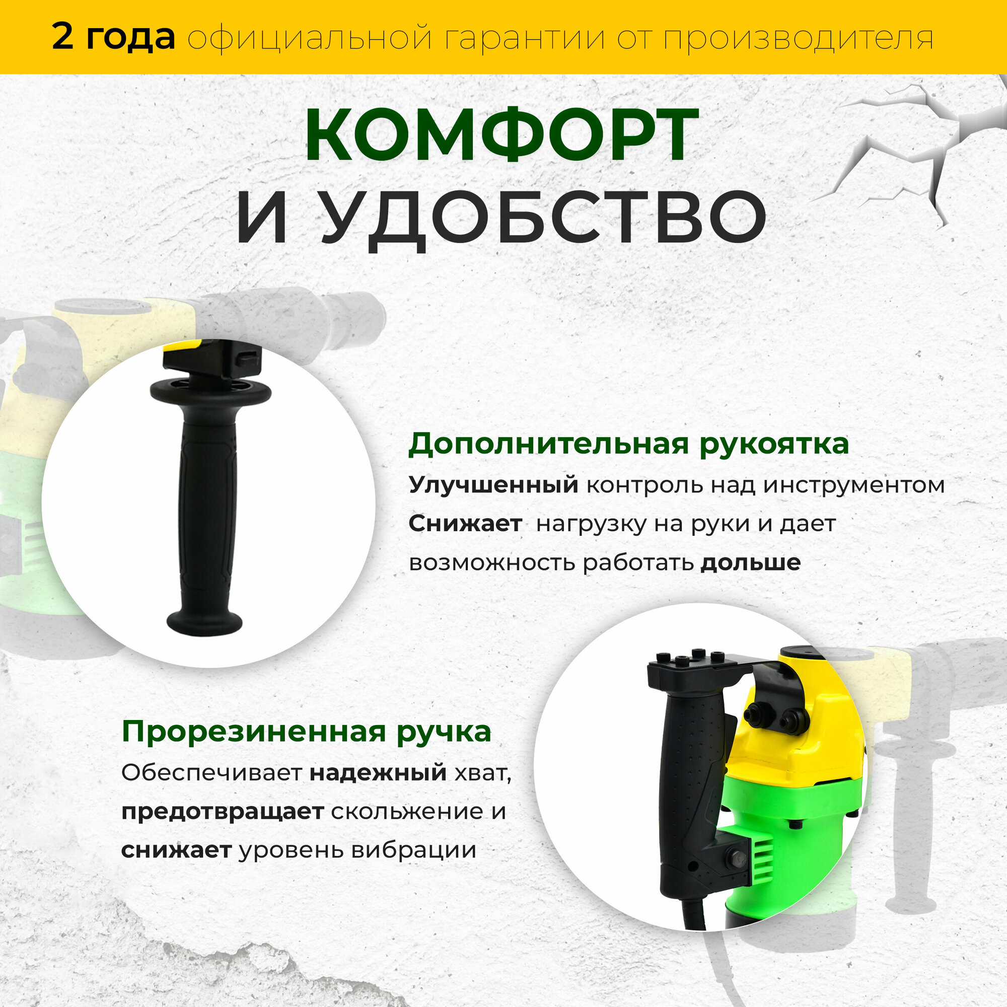 | Дополнительно в комплекте | дополнительная рукоятка / дополнительные щетки / зубило/пика |