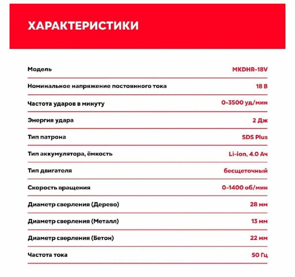 Бесщеточный аккумуляторный перфоратор 18В, MKDHR-18V ProfiPower 9 750 ₽