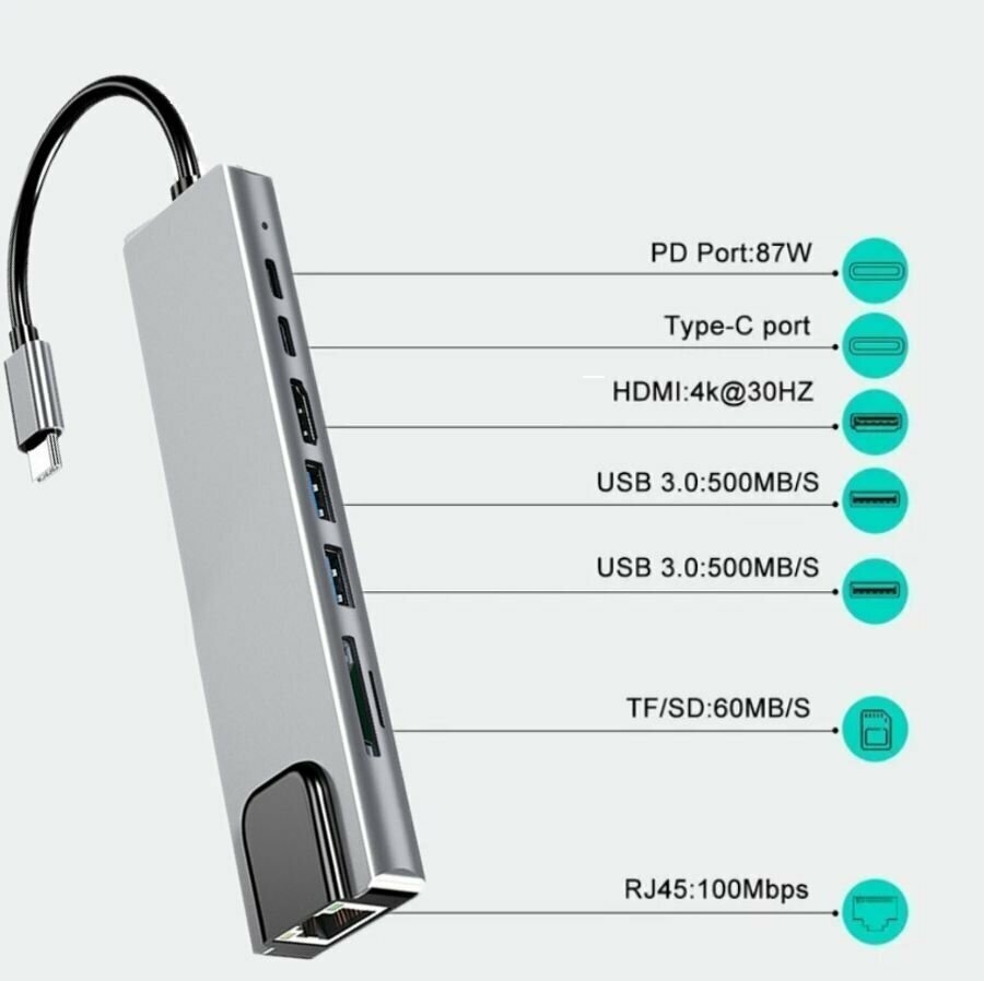 USB Hub разветвитель 8 в 1 с Type-C HDMI | RJ-45 | 2xUSB 3.0 | 2xType-C | SD | TF | PD информация: