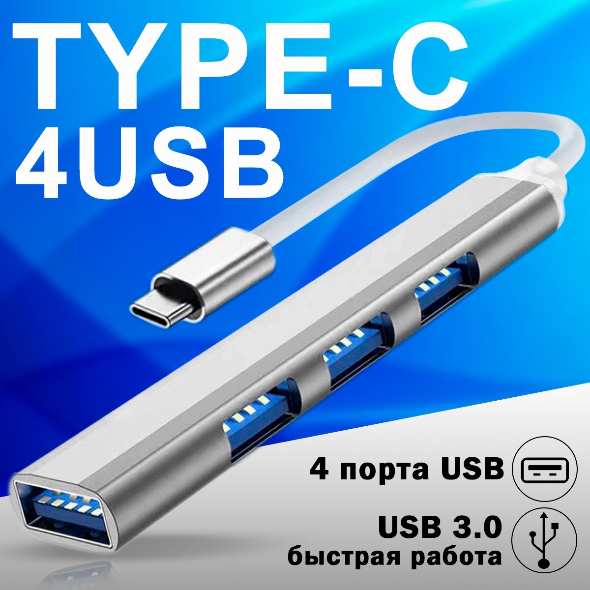 10 цен на Разветвитель универсальный, USB HUB USB Type-C концентратор 3.0 на 4 порта, Хаб на 4 USB (0,1 м) серебристый