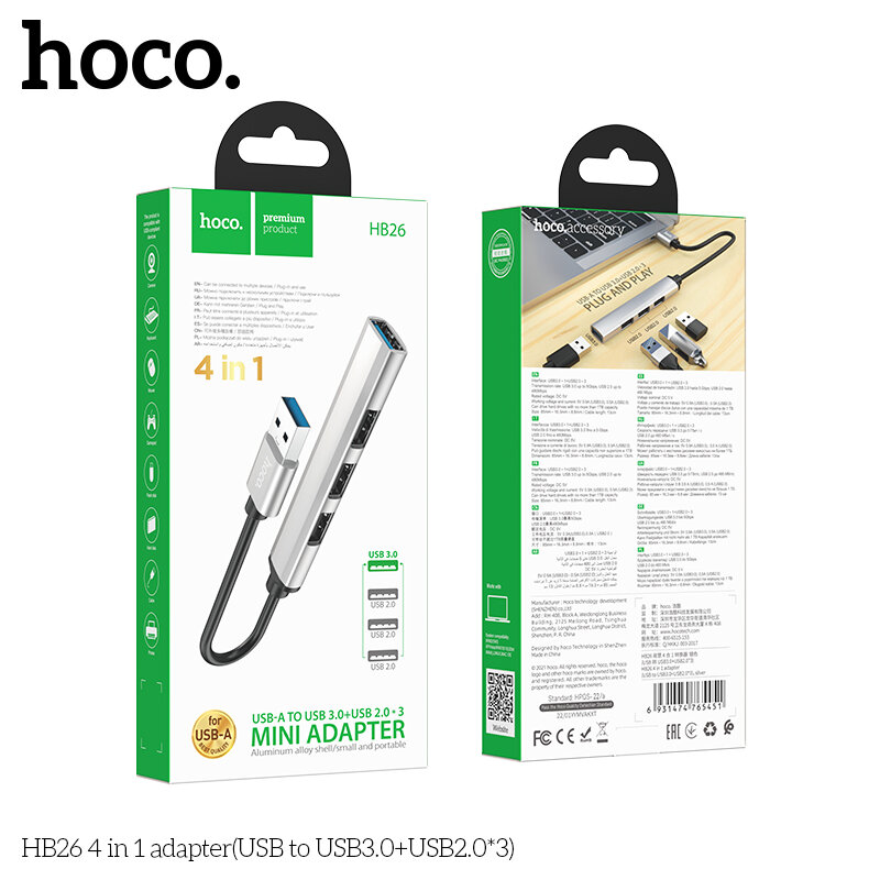 Отзывы на USB HUB разветвитель HOCO HB26 4 в 1 USB3.0 (m) - USB3.0 (f) + 3xUSB2.0 (f), серебристый