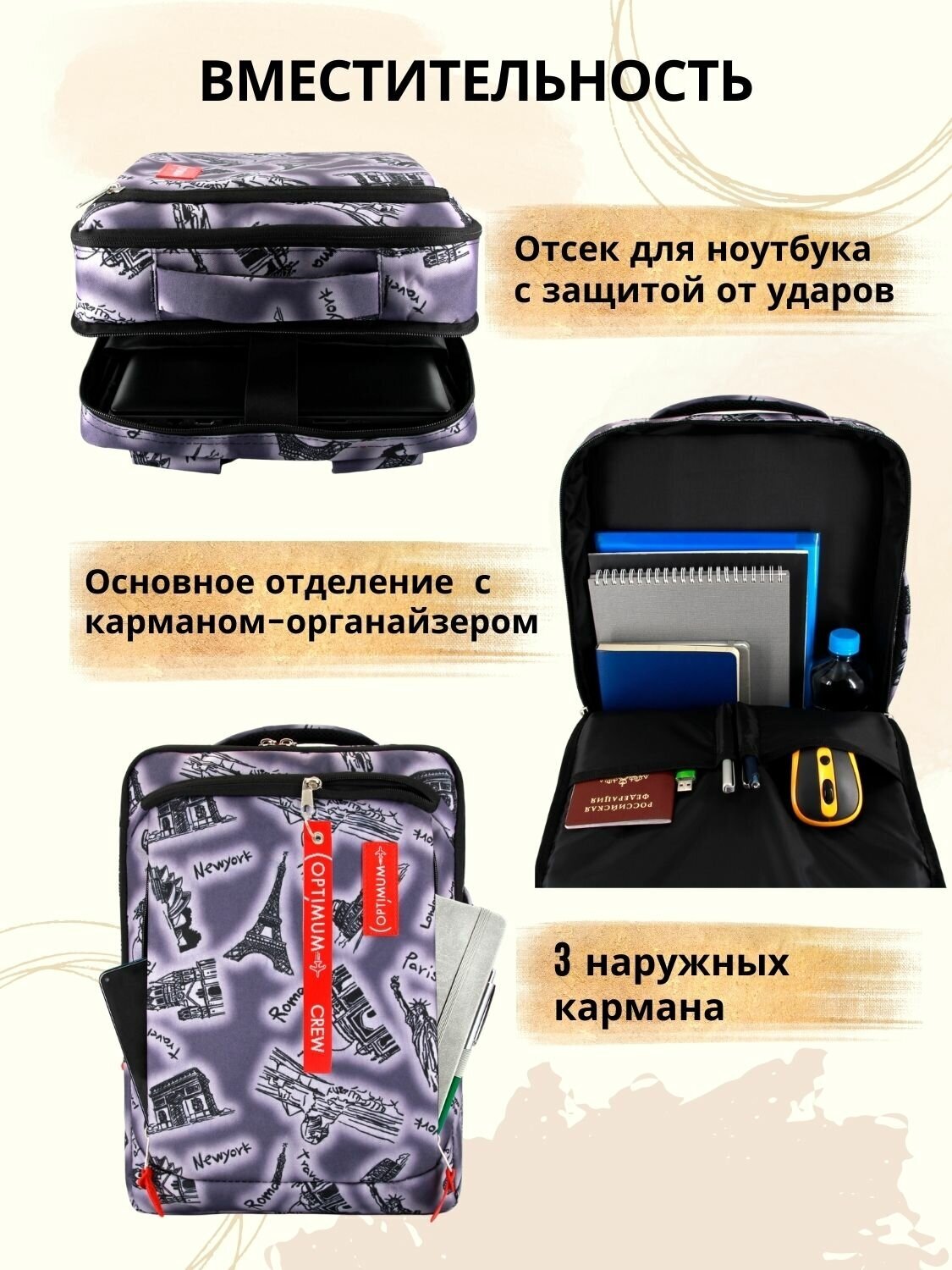 Рюкзак для ноутбука 15.6 17 17.3 дюймов мужской женский, города информация: