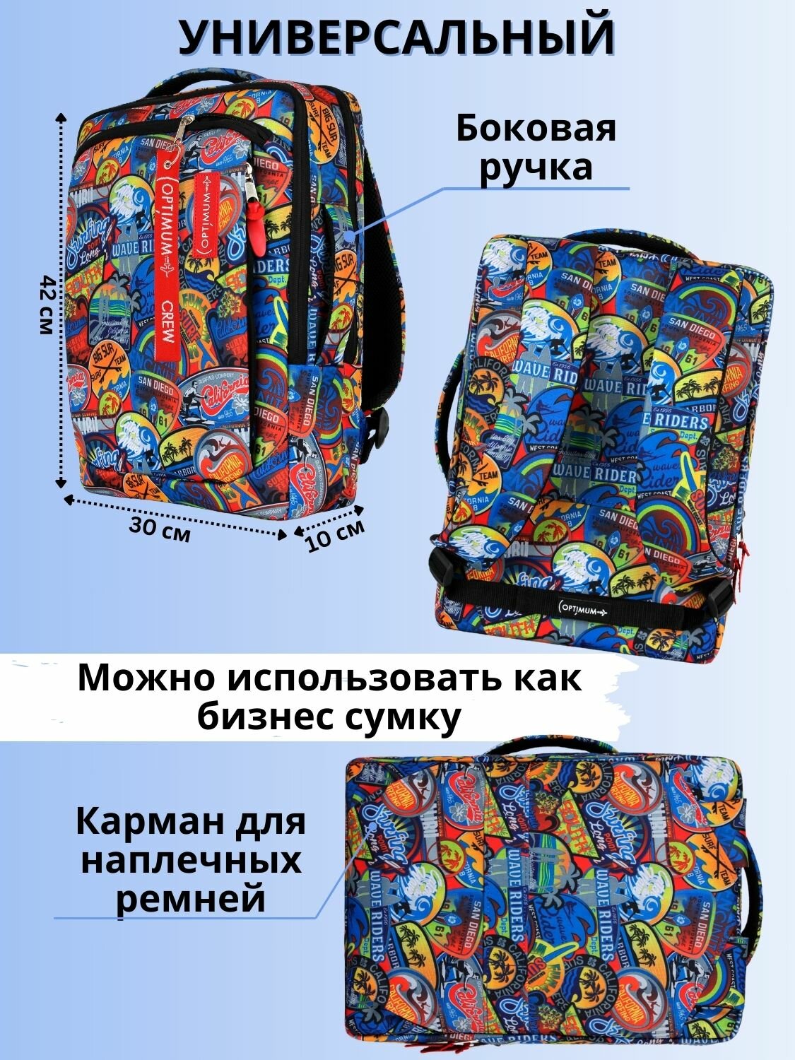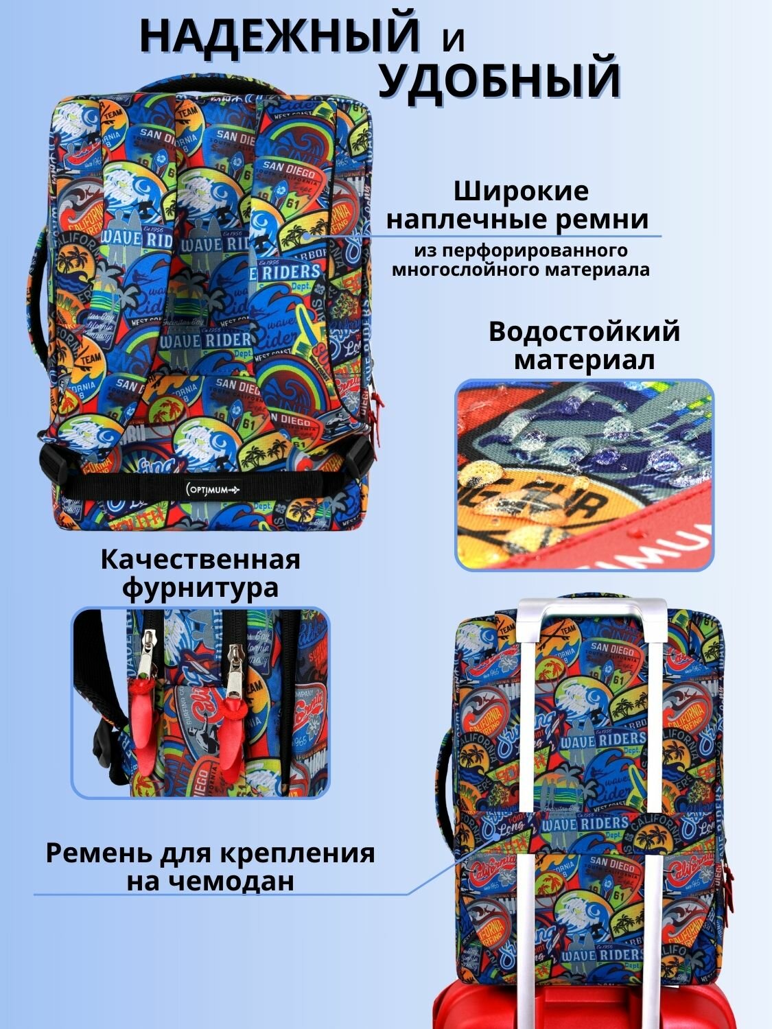 | Особенности | внешний карман, возможность крепления на тележку, защита от воды, карман для телефона, отделение-органайзер |
