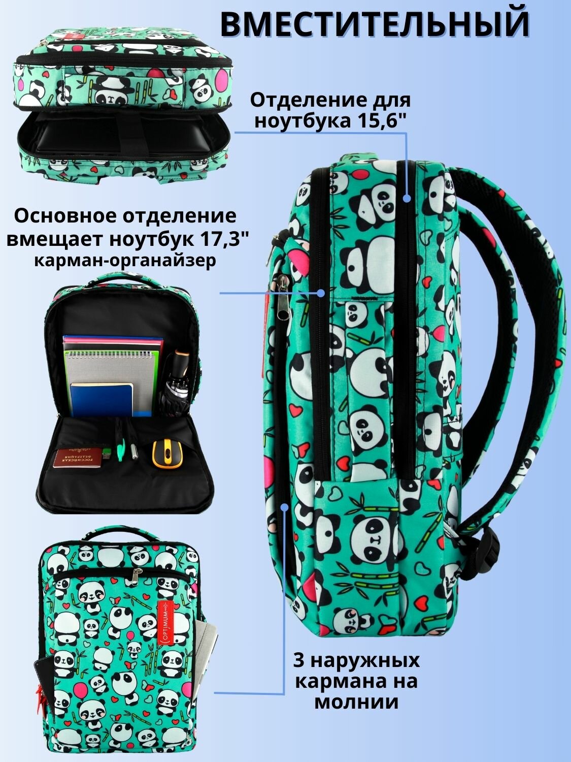 Рюкзак для ноутбука 15.6 17 17.3 дюймов мужской женский, панды информация: