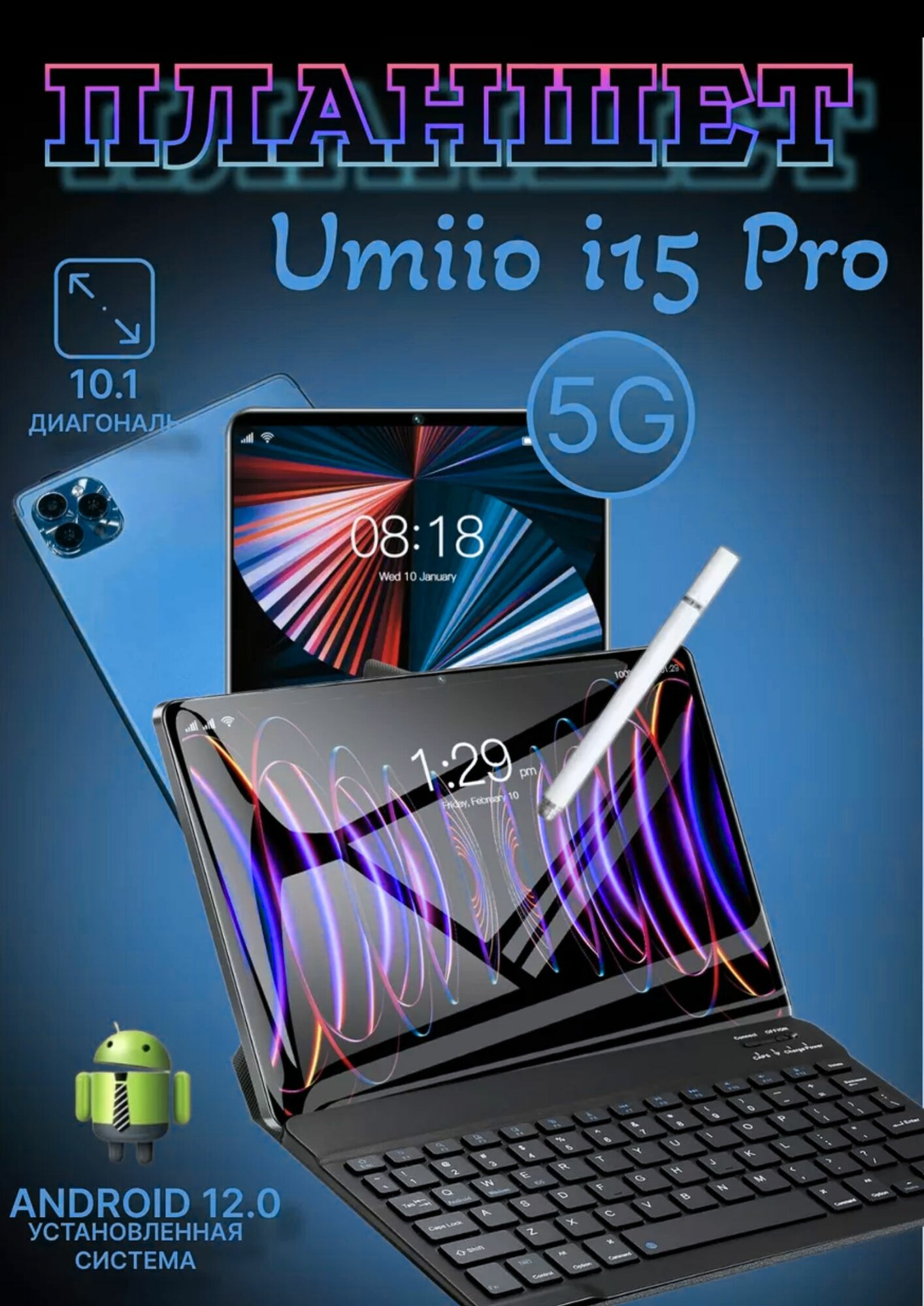 Планшет с клавиатурой Umiio i15 pro 6/128 Gb, ANDROID 12, 7000 мА*ч, Синий информация: