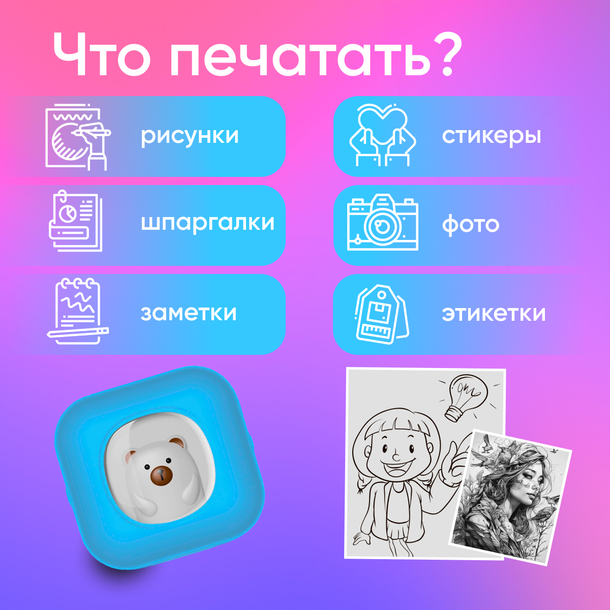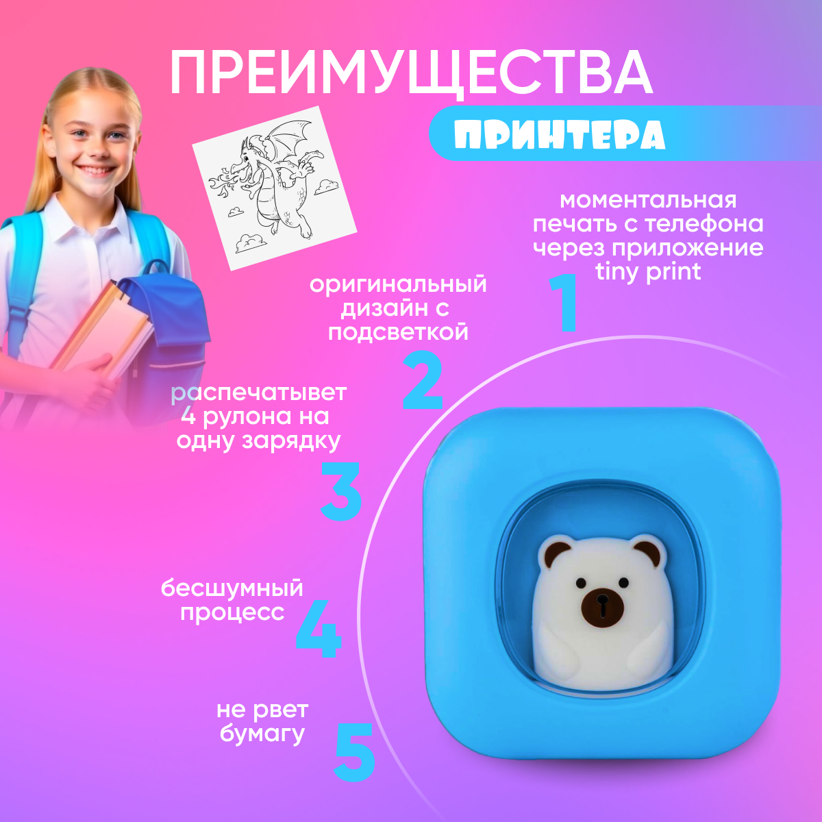 Отзывы на Мини-принтер детский для телефона с подсветкой (работает с приложением Tiny Print)