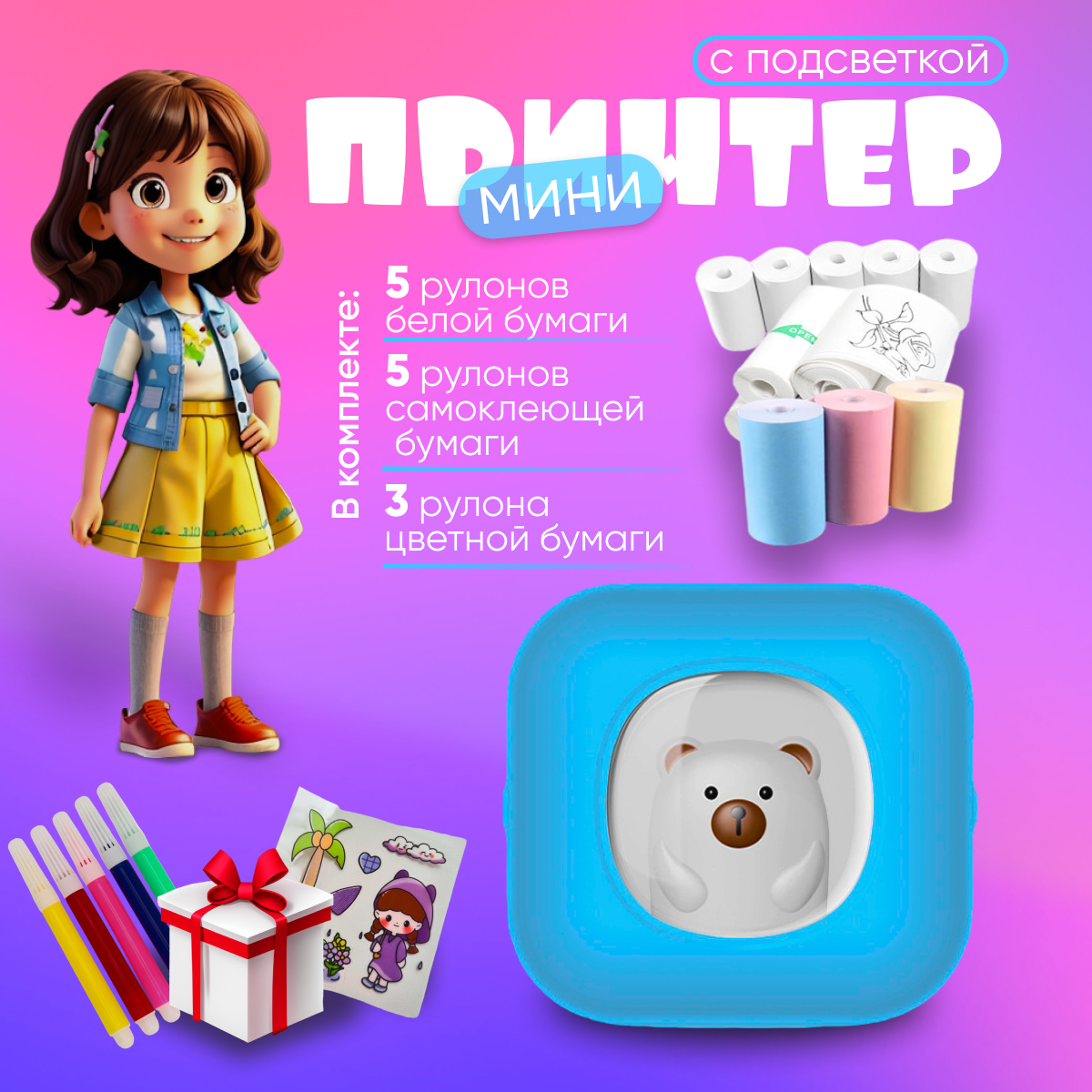 10 цен на Мини-принтер детский для телефона с подсветкой (работает с приложением Tiny Print)