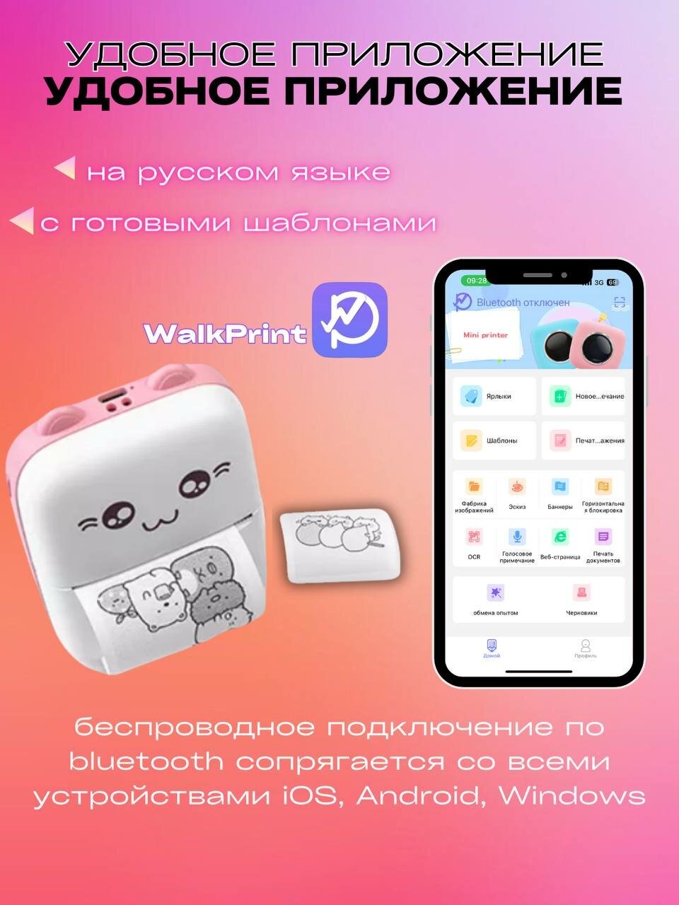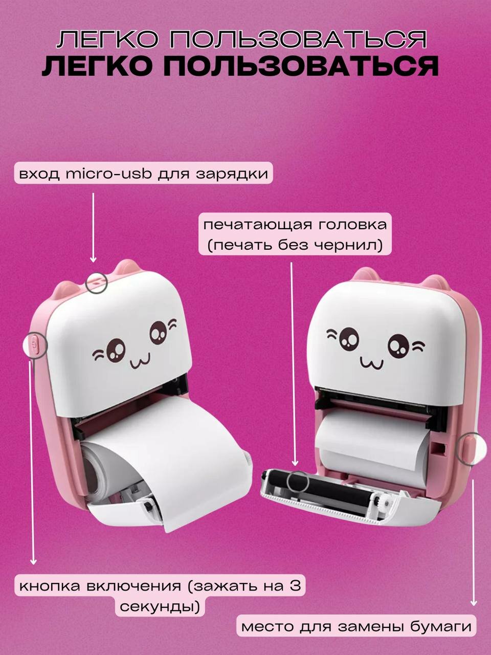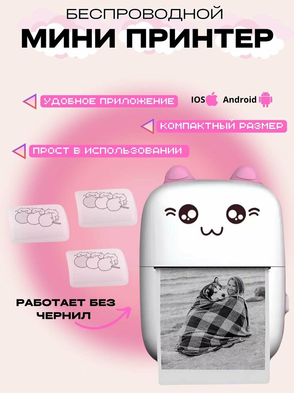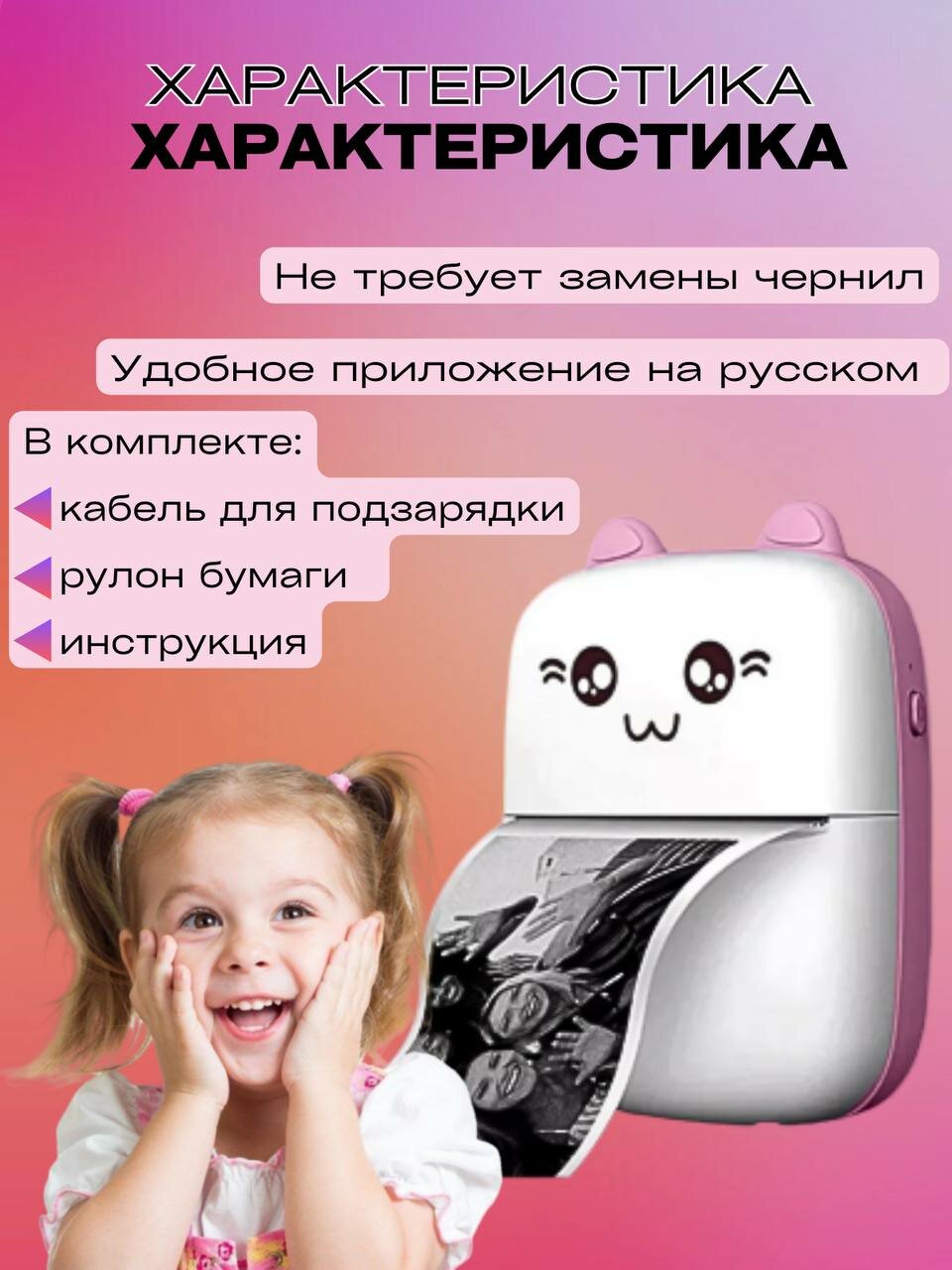 Мини-принтер "Котик" - печать фотографий и стикеров для детей информация: