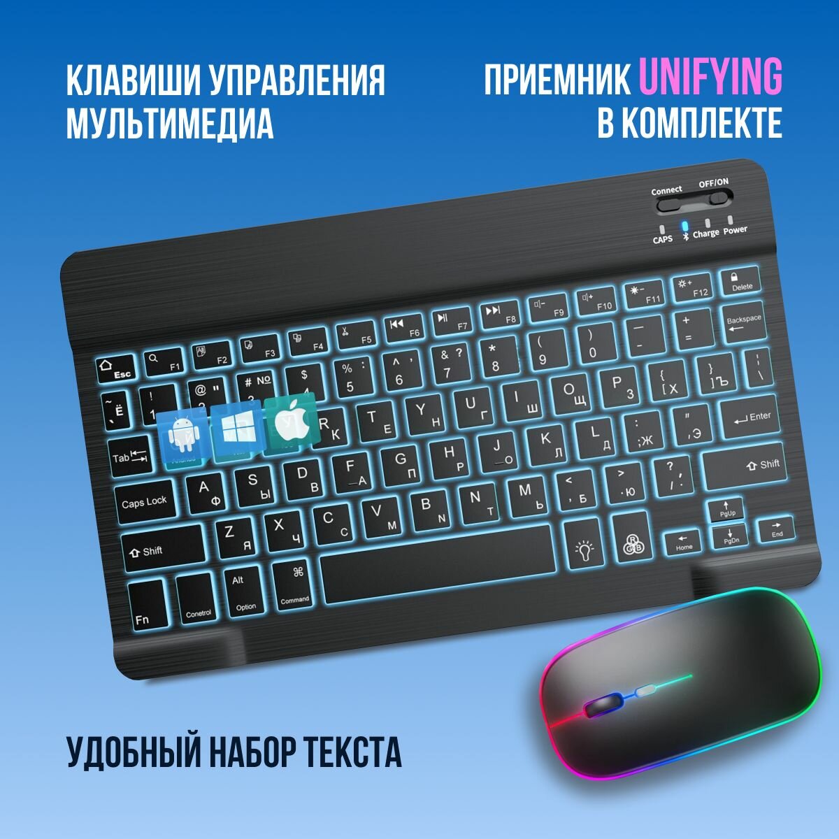 Беспроводная клавиатура и мышь с подсветкой RGB / Комплект Мышь + Клавиатура ультратонкая, русская раскладка / Набор для планшета, Bluetooth, Android информация:
