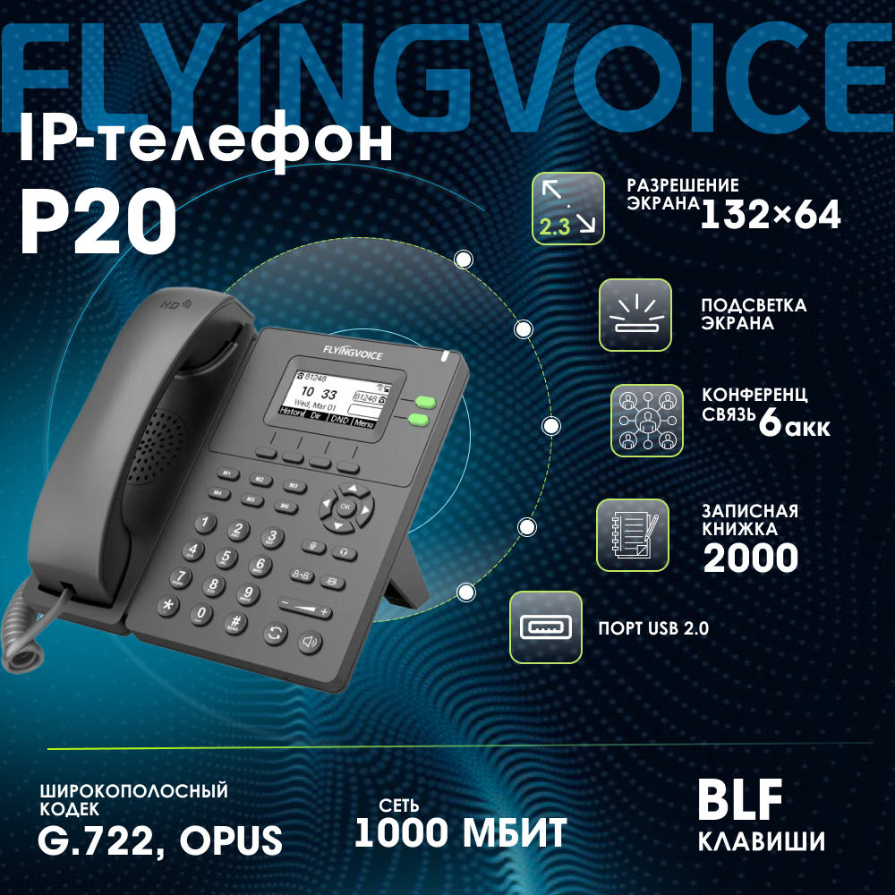 Отзывы на IP-телефон FLYINGVOICE P20, 2 SIP аккаунта, монохромный дисплей 2,3 дюйма, 132 x 64 с подсветкой, конференция на 6 абонентов, (RJ9)/DECT, USB и Wi-Fi
