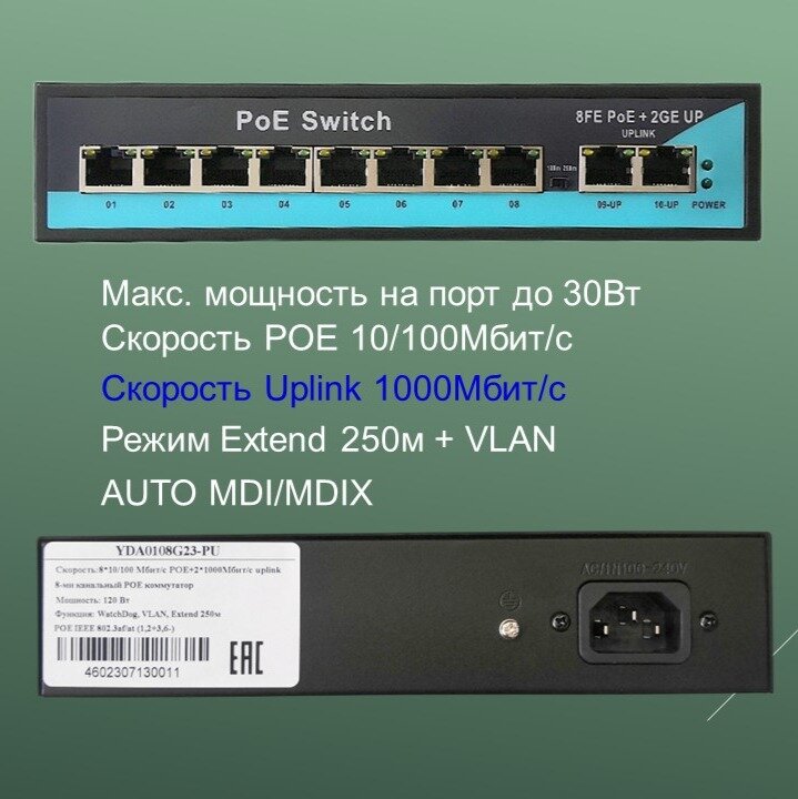 Коммутатор YDA POE 8POE+2Uplink 1000 Мбит/с, WatchDog+VLAN, 250 метров,120 Ватт, процессор IC REALTEK информация: