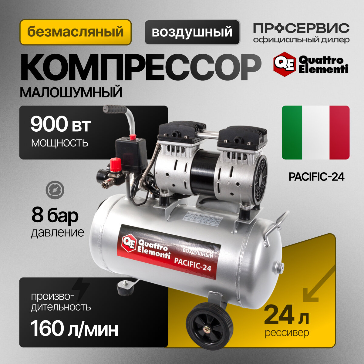 Компрессор поршневой безмасляный QUATTRO ELEMENTI PACIFIC-24 (8 Бар, 160 л/мин, 900 Вт, 24 л, 19 кг) информация: