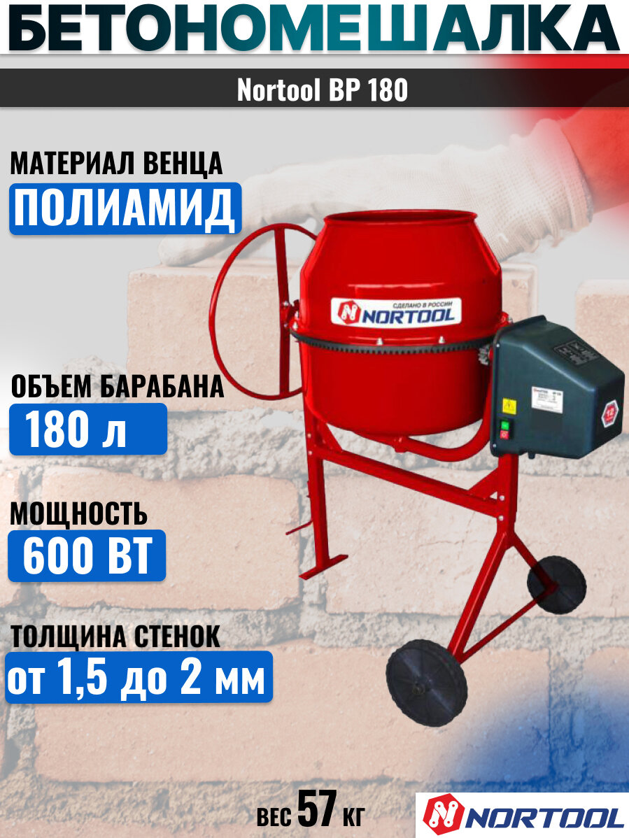 10 цен на Бетономешалка Nortool BP 180, полиамидный венец, порошковая окраска