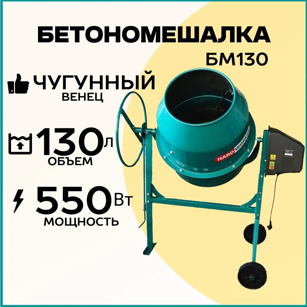 Бетономешалка строительная HARD WORKER БМ130 чугунный венец, объем 130 литров, мощность 600 Вт, бетоносмеситель электрический информация: