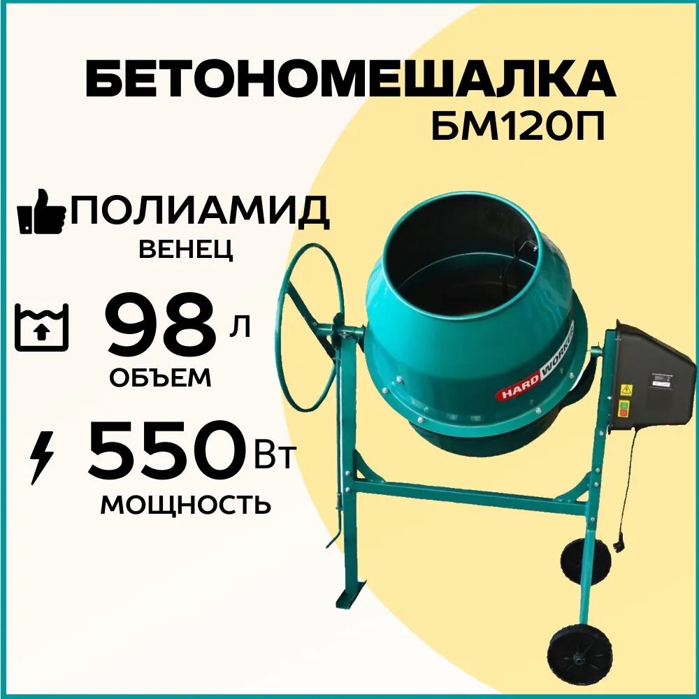 10 цен на Бетономешалка строительная HARD WORKER БМ120П полиамидный венец, объем 98 литра, мощность 550 Вт, бетоносмеситель электрический