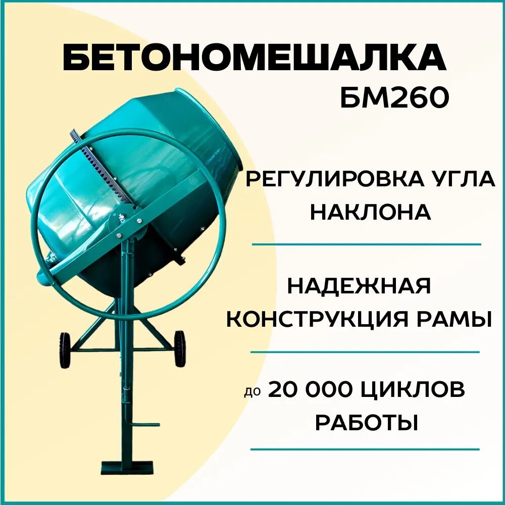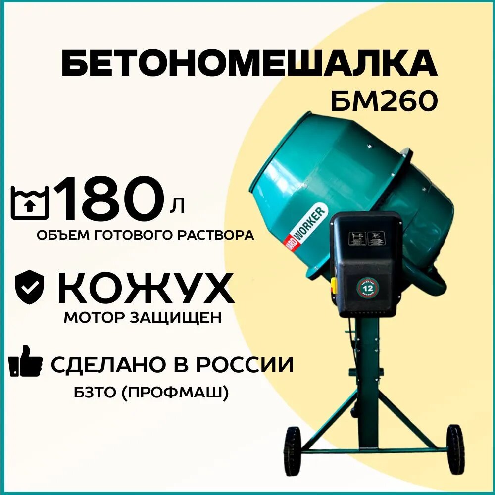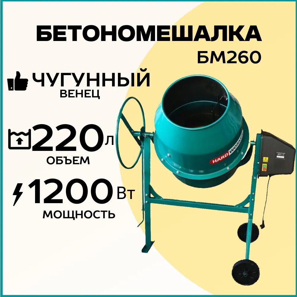 10 цен на Бетономешалка строительная HARD WORKER БМ260 чугунный венец, объем 220 литров, мощность 1200 Вт, бетоносмеситель электрический
