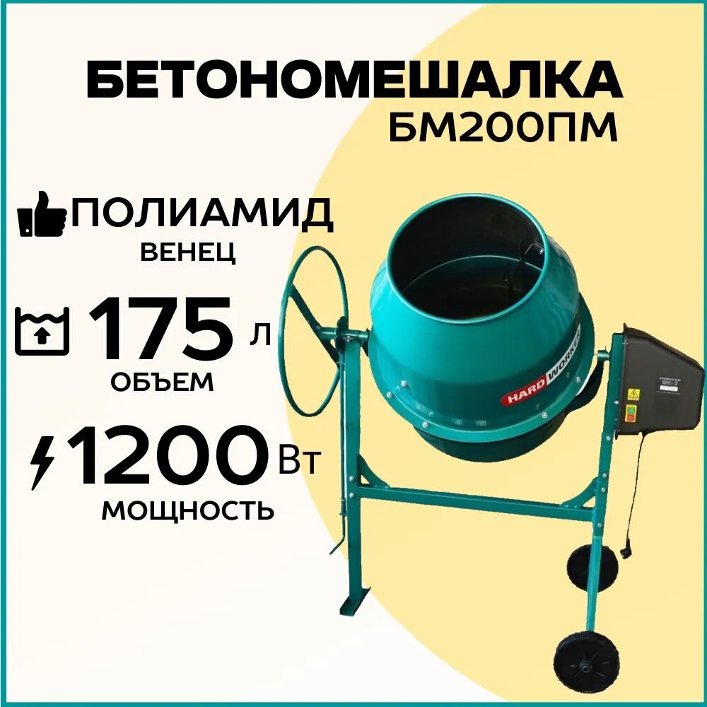 Бетономешалка строительная HARD WORKER БМ200ПМ полиамидный венец, объем 175 литров, мощность 1200 Вт, бетоносмеситель электрический информация: