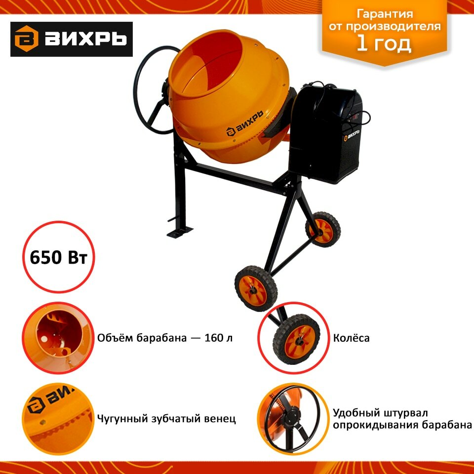 Отзывы на Бетономешалка Вихрь БМ-160, электрический двигатель, 160 л, 29.5 об/мин, 650 Вт, 220 В