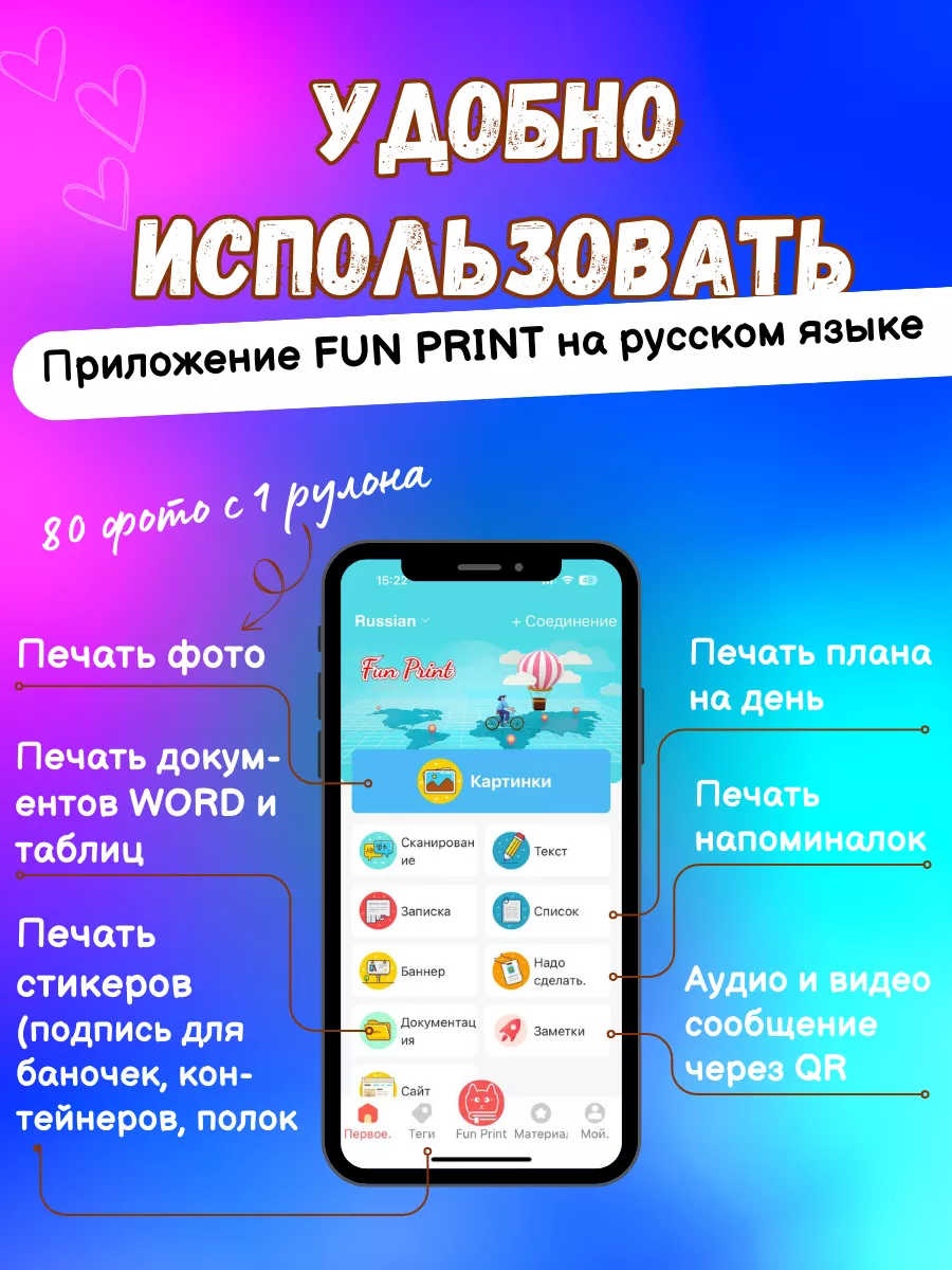 | Комплектация | Принтер х1, цветная бумага х3, самоклейка х5, термобумага х5, фломастеры х5 |
