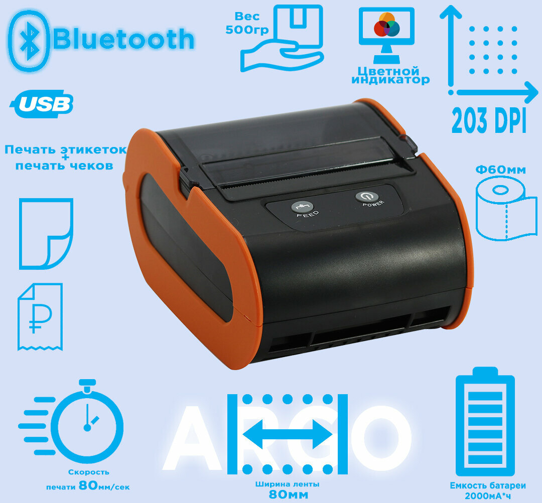 Термопринтер портативный для этикеток 80мм Bluetooth+USBC. Android, iOS, ПК. Этикетки отправлений озон, Вайлдбериз . Черно-Оранжевый. WP ATP80D информация: