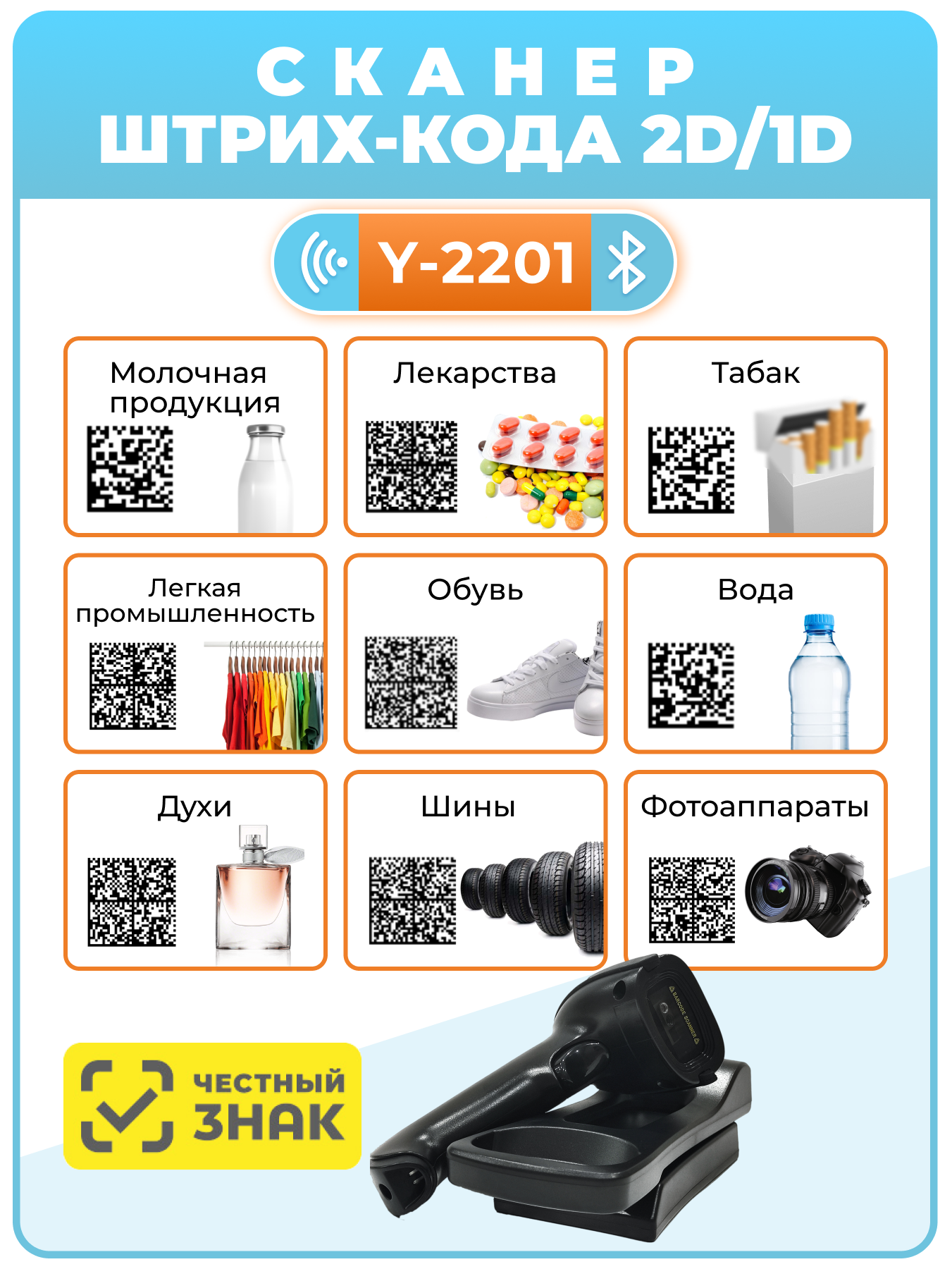 Сканер штрих-кода 2D Y-2201 беспроводной, с регулируемой базой-подставкой информация:
