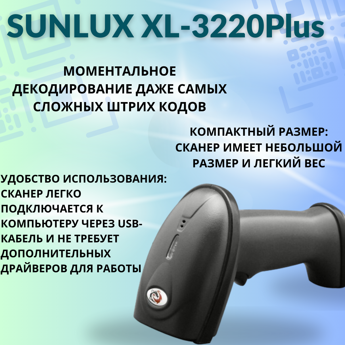 Проводной 2D сканер штрих кода SUNLUX XL-3220Plus для маркировки ЕГАИС Честный знак QR Эвотор Атол Меркурий 1D PDF417 DATA MATRIX информация: