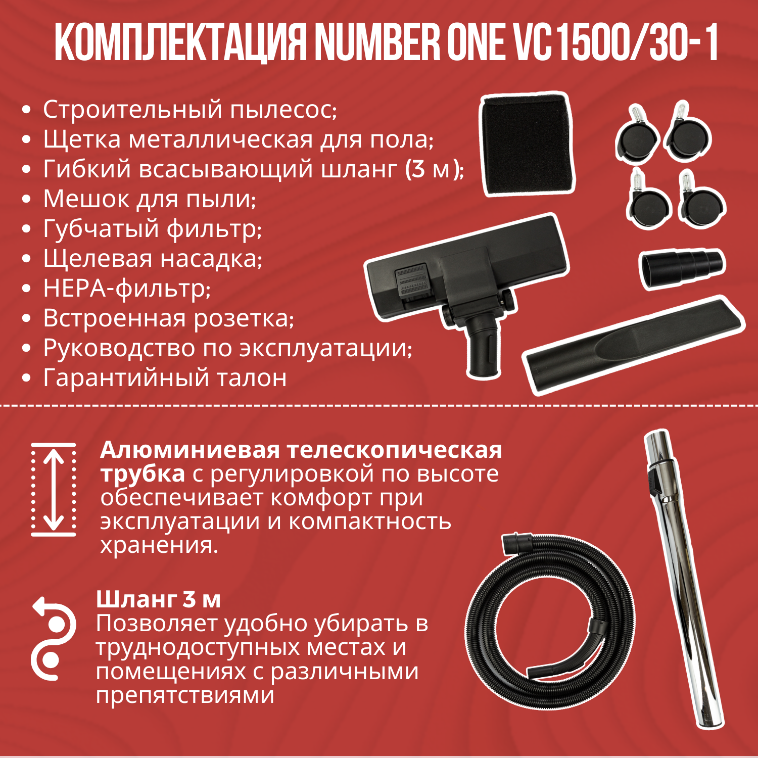 Пылесос строительный NUMBER ONE VC1500/30-1 1500Вт,30 л информация: