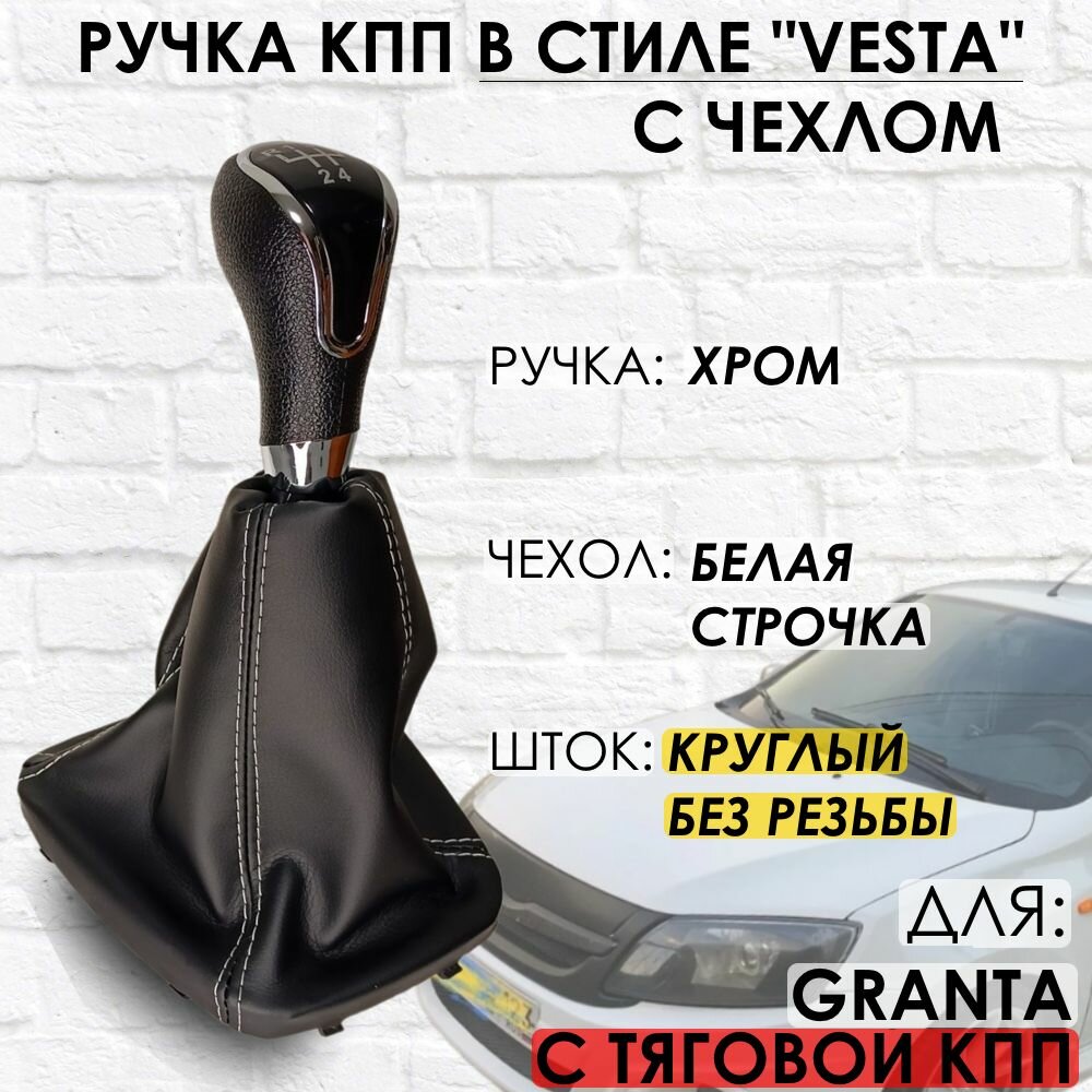 Ручка КПП с чехлом для Lada Granta С кулисой до 2013 г.в. "Веста стиль" (Хром/белая строчка) информация: