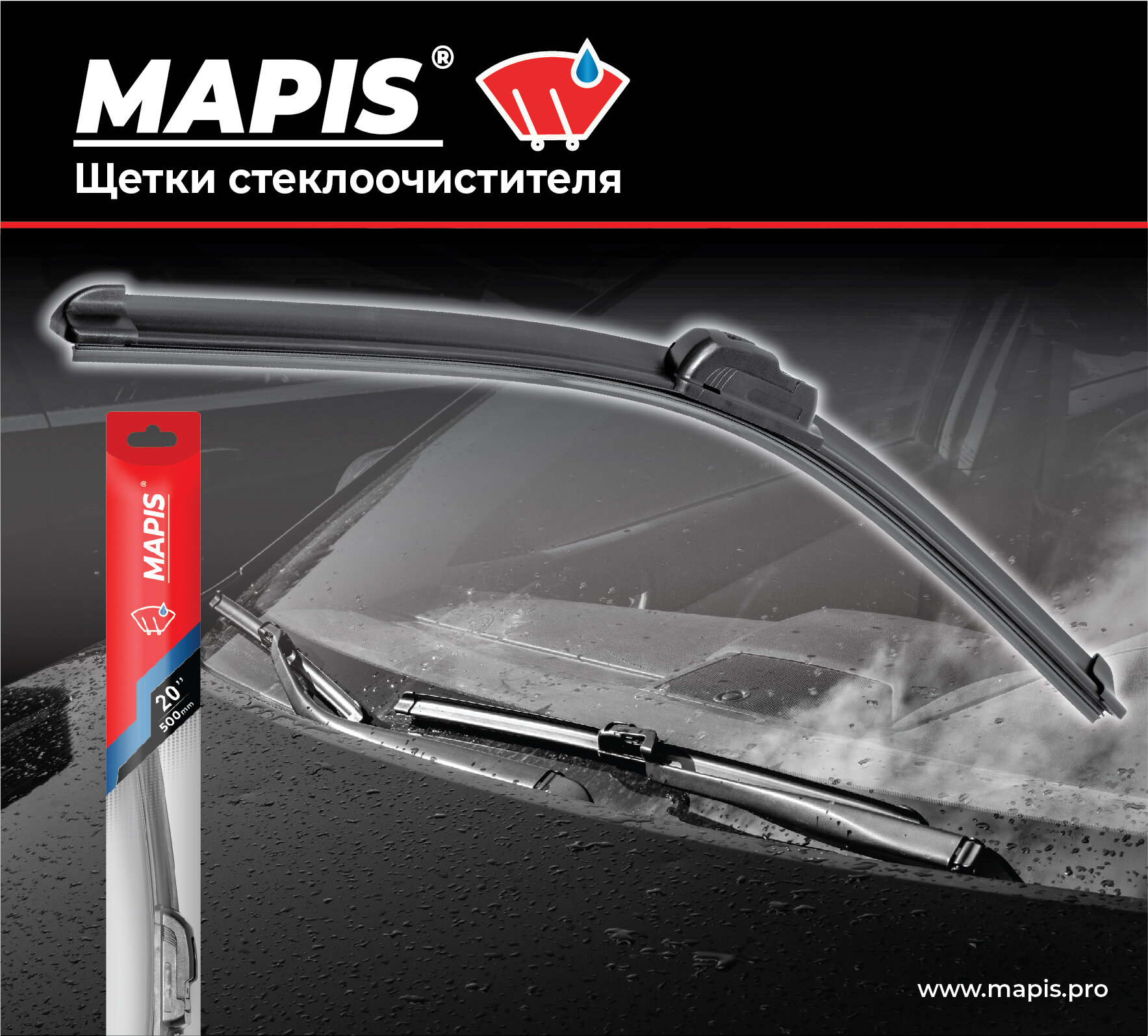 Бескаркасная щетка стеклоочистителя 50 / 20см, MAPIS, черный / красный, всесезонная