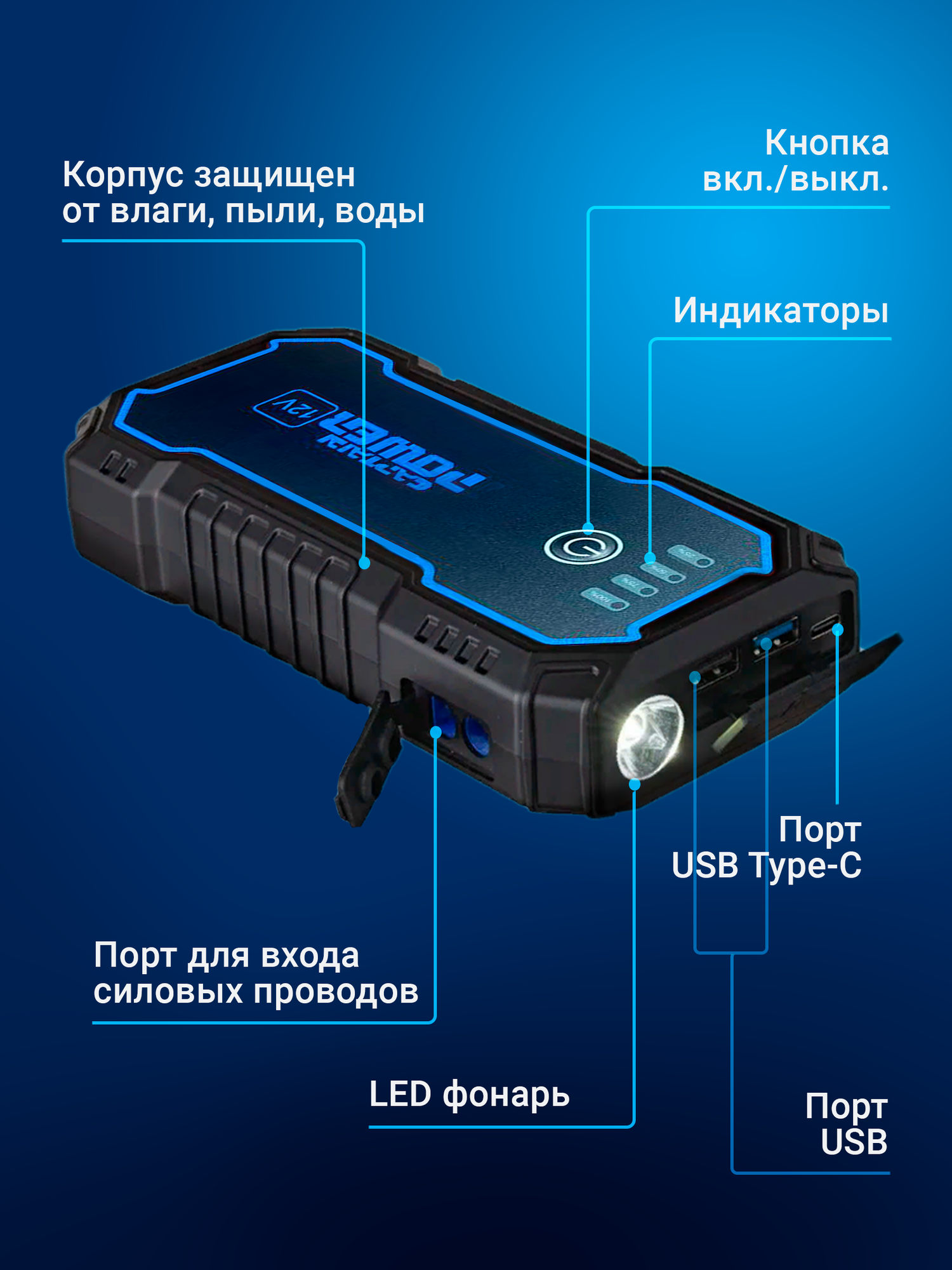Пусковое устройство для авто, LED фонарь, черный матовый, 800 А, 18 см