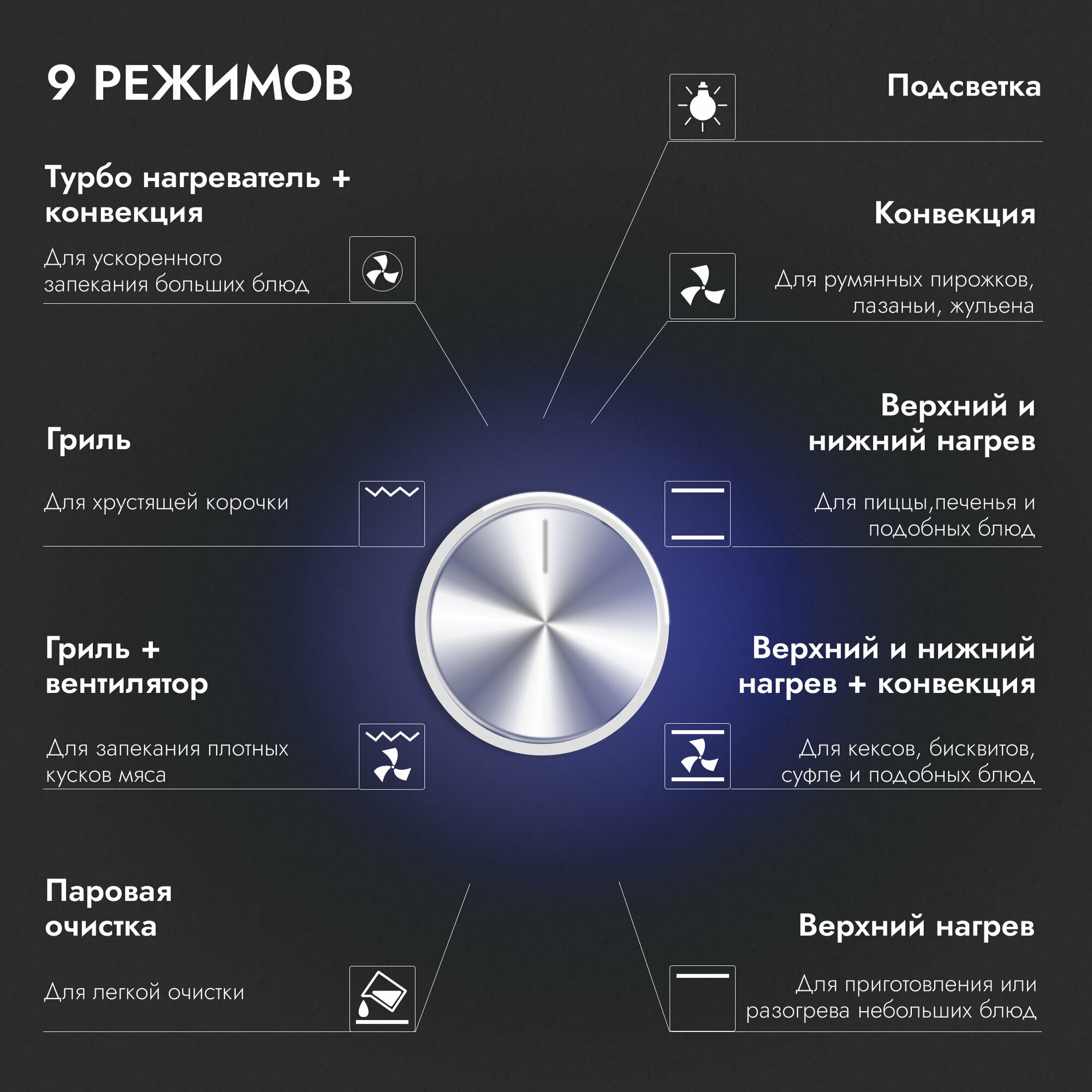 | Режимы нагрева | верхний нагрев, верхний нагрев + конвекция, верхний нагрев + нижний нагрев, гриль + конвекция, нижний нагрев + конвекция |