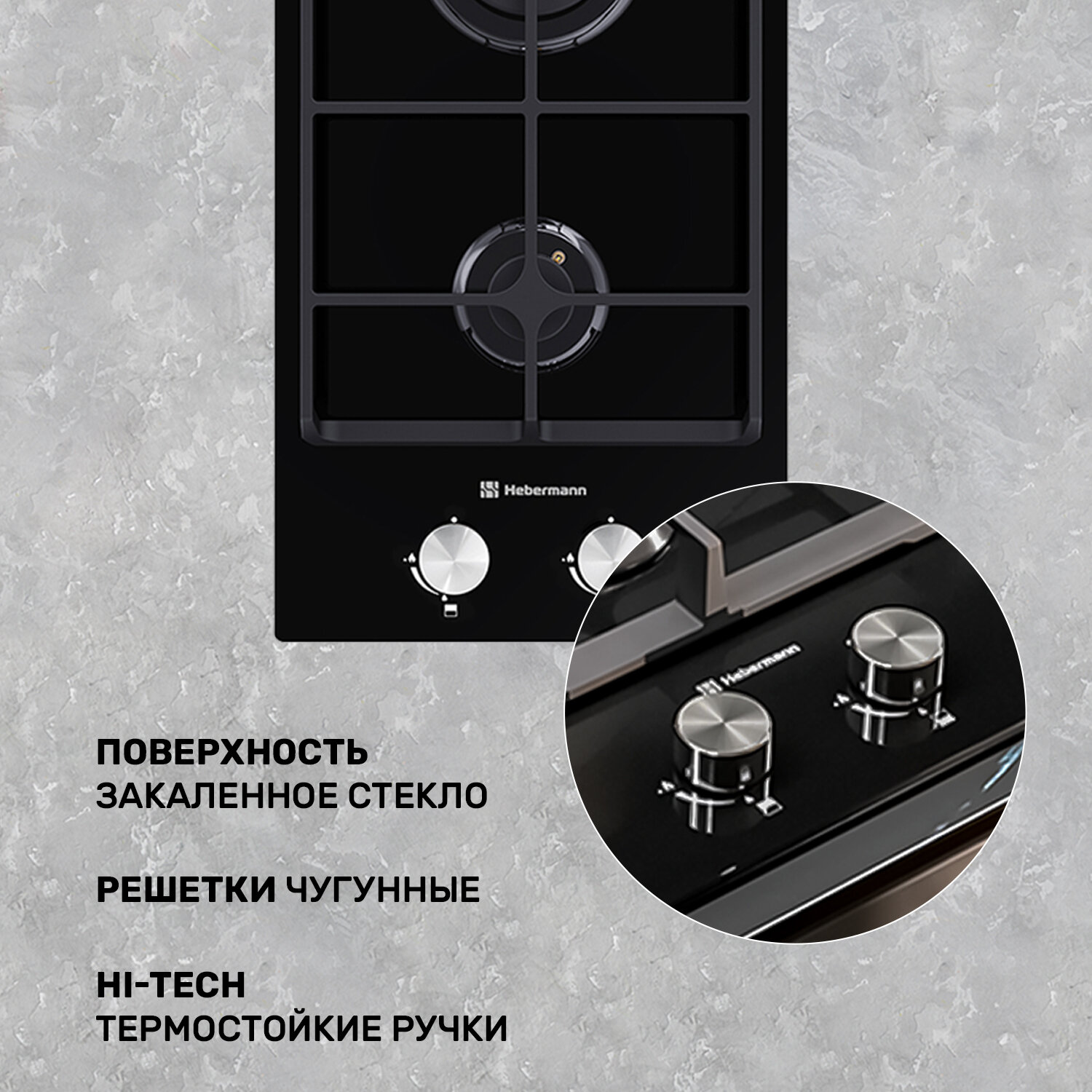 10 цен на Варочная панель газовая Hebermann HBGG 302.1 B, материал поверхности: закалённое стекло, материал решёток: чугун, термостойкие ручки Hitech, управление: Механическое, Электроподжиг, Газ-контроль