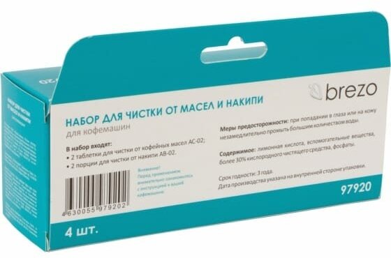 Набор для чистки кофемашин Brezo 97920 (2 табл. для чистки от коф.масел, 2 порции для очистки от нак информация: