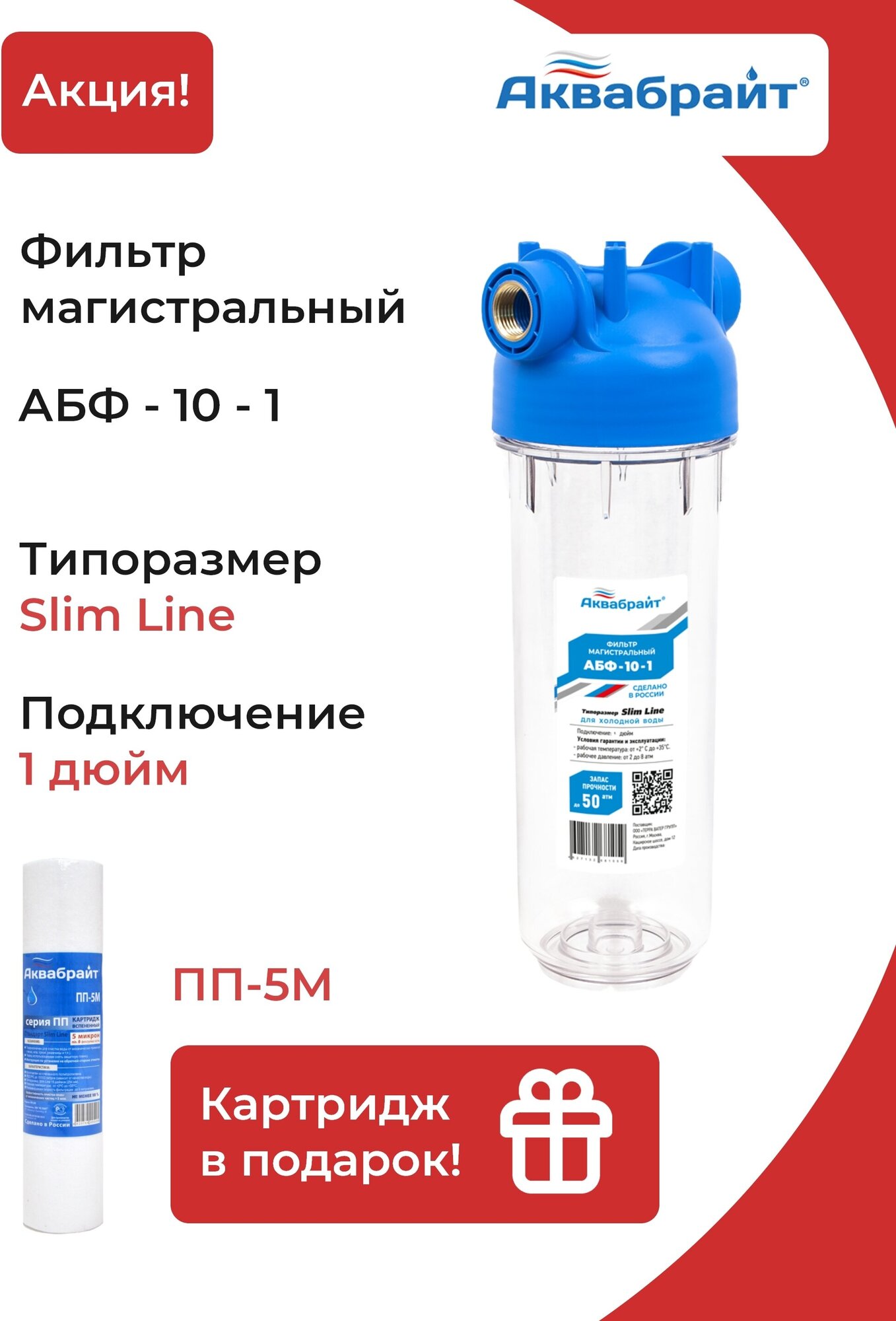 Фильтр магистральный аквабрайт АБФ-10-1 Slim Line для холодной воды Прозрачный + Картридж ПП-5М информация: