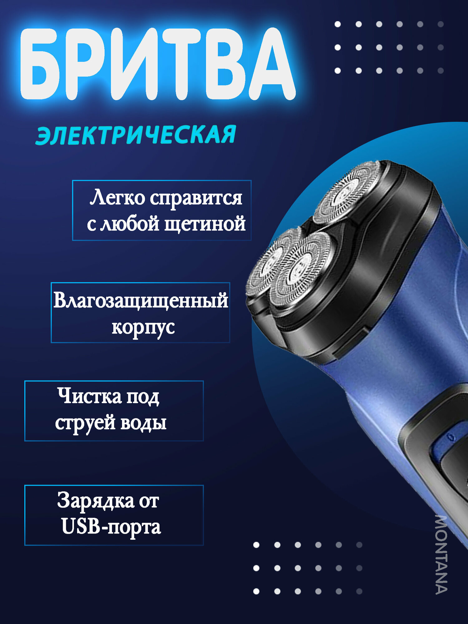 10 цен на Бритва,электрическая бритва,мужская бритва,роторная, 3 плавающих головки, до 90 минут автономной работы,быстрая зарядка, синий-черный